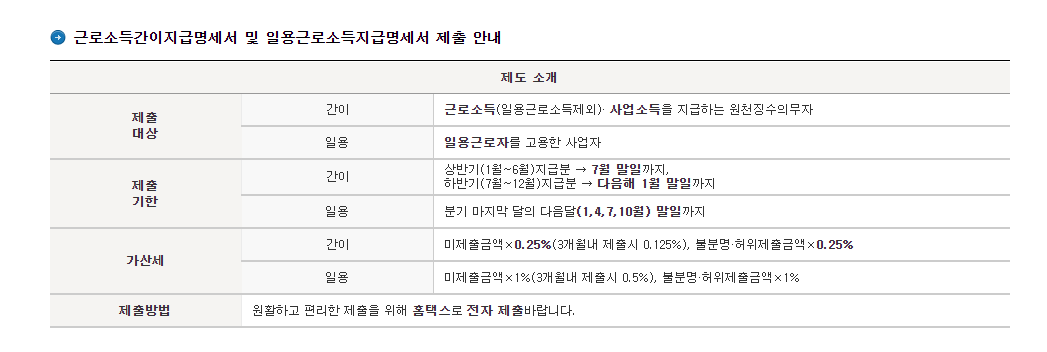| ㅇ (가산세) 지급금액 × 0.5% * 기한 후 3개월 이내 제출시 50% 감면 | ㅇ (가산세) 지급금액 × 0.25% * (좌 동) |