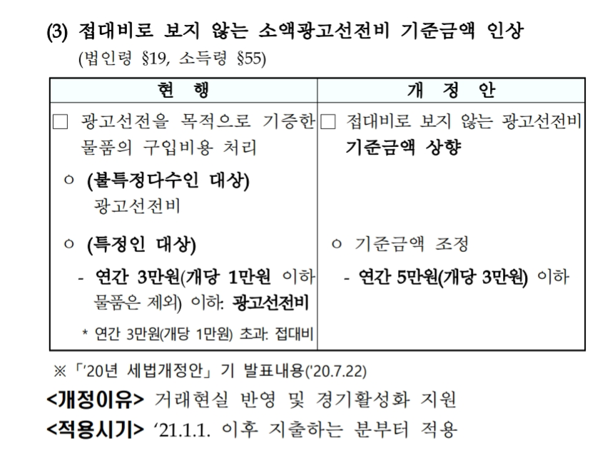 소액광고선전비 기준금액 개당 3만원 ☞ 5만원 (연간) , 소액접대비 3만원이하 '21.1.1.이후 작성자주황규|작성시간21.08.11|조회수990 목록 댓글 0 글자크기 작게가 글자크기 크게가 http://hantax.co.kr/xe/qna/14407세무사 한장석 - 사업상증여시 공급의제와 추가적인 세무문제1.공급의제 중 사업상증여편에 보면 광고선전비로 불특정다수에게 제공한 경우 간주공급대상이 아니라고되어있습니다만 구매고객에게 무상증여(특정조건해당하는경우, 예로 결혼기념일에 구hantax.co.kr 다음검색 현재 게시글 추가 기능 열기 북마크 공유하기 신고 센터로 신고 댓글 댓글 0 댓글쓰기 답글쓰기 댓글 리스트