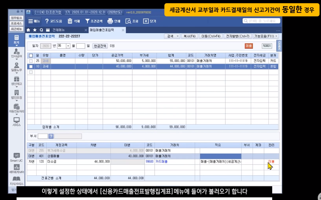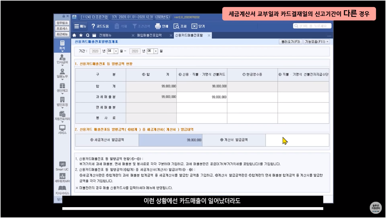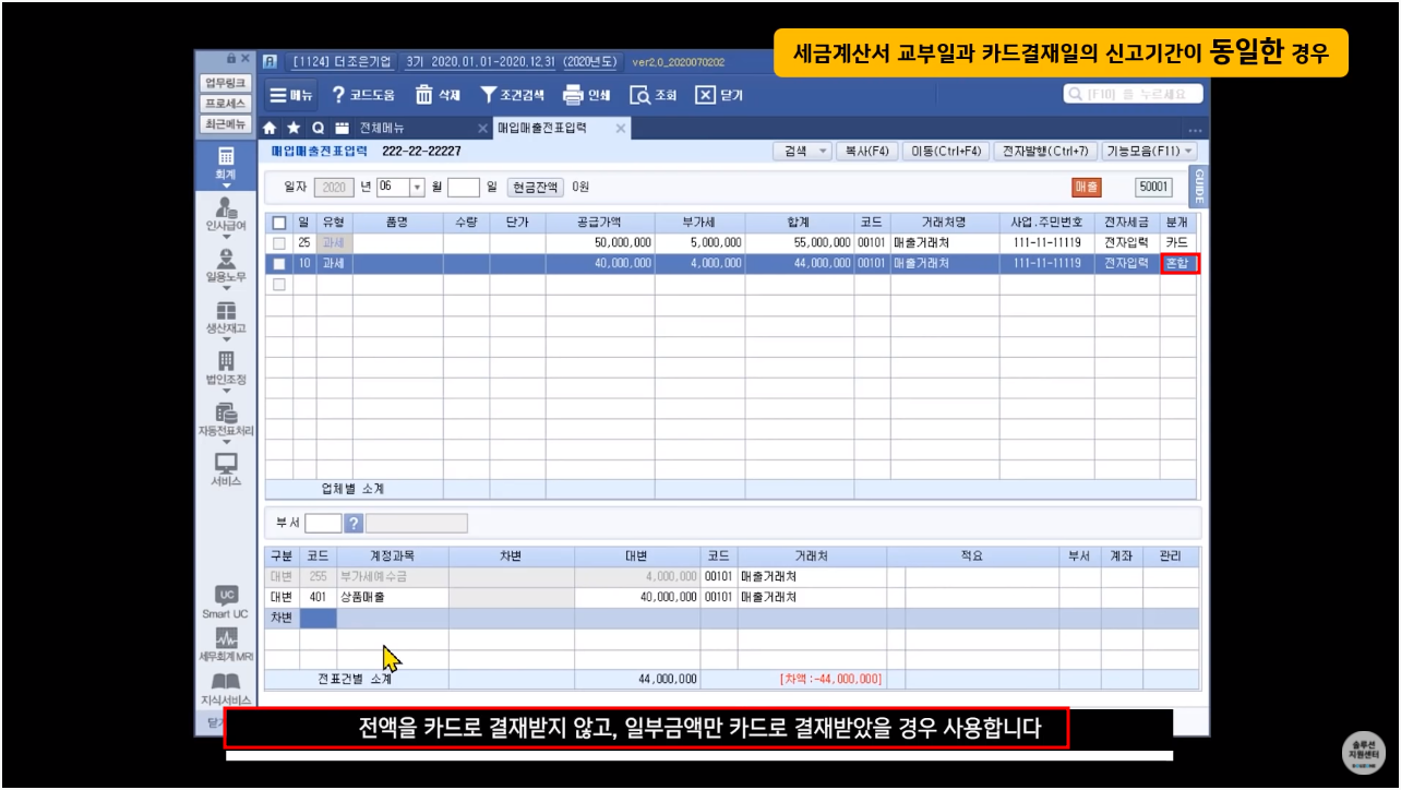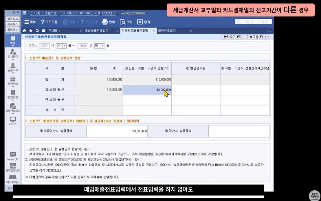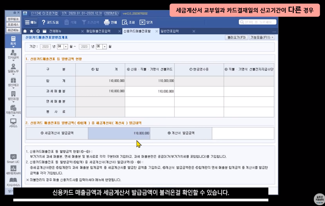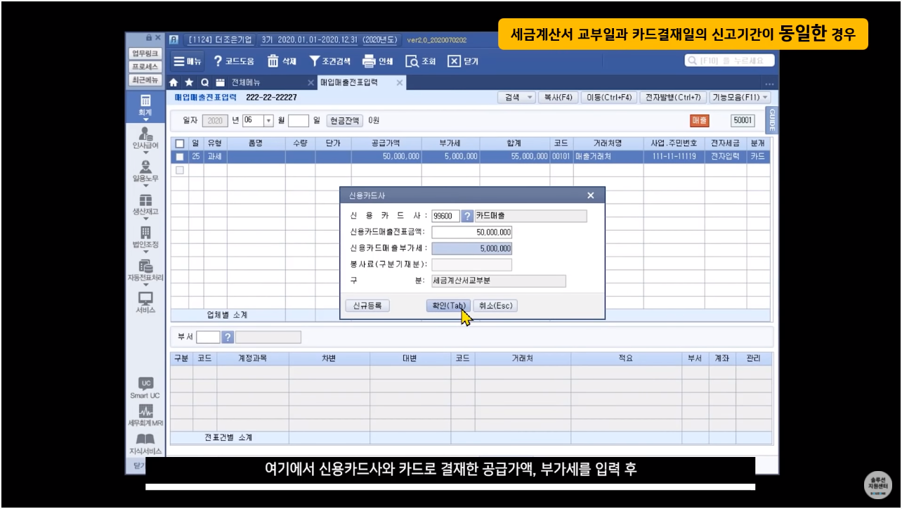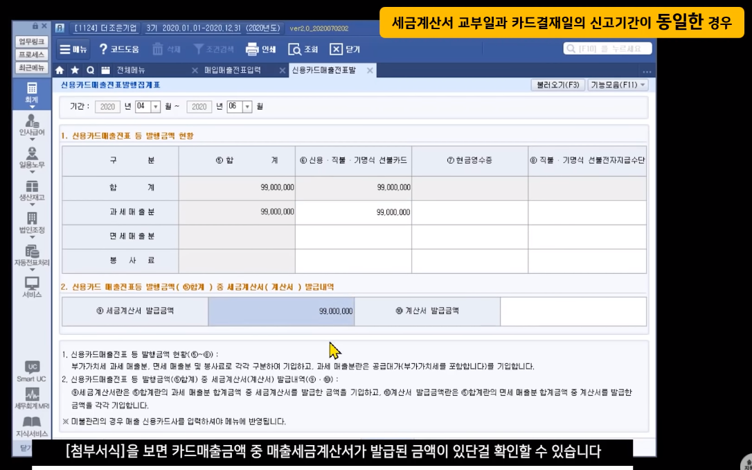 [더존 Smart A] 부가세 사용방법 | 신용카드매출전표발행집계표 | 세금계산서 교부분에 대해서 신용카드로 결제를 한 경우 어떻게 입력하나요?