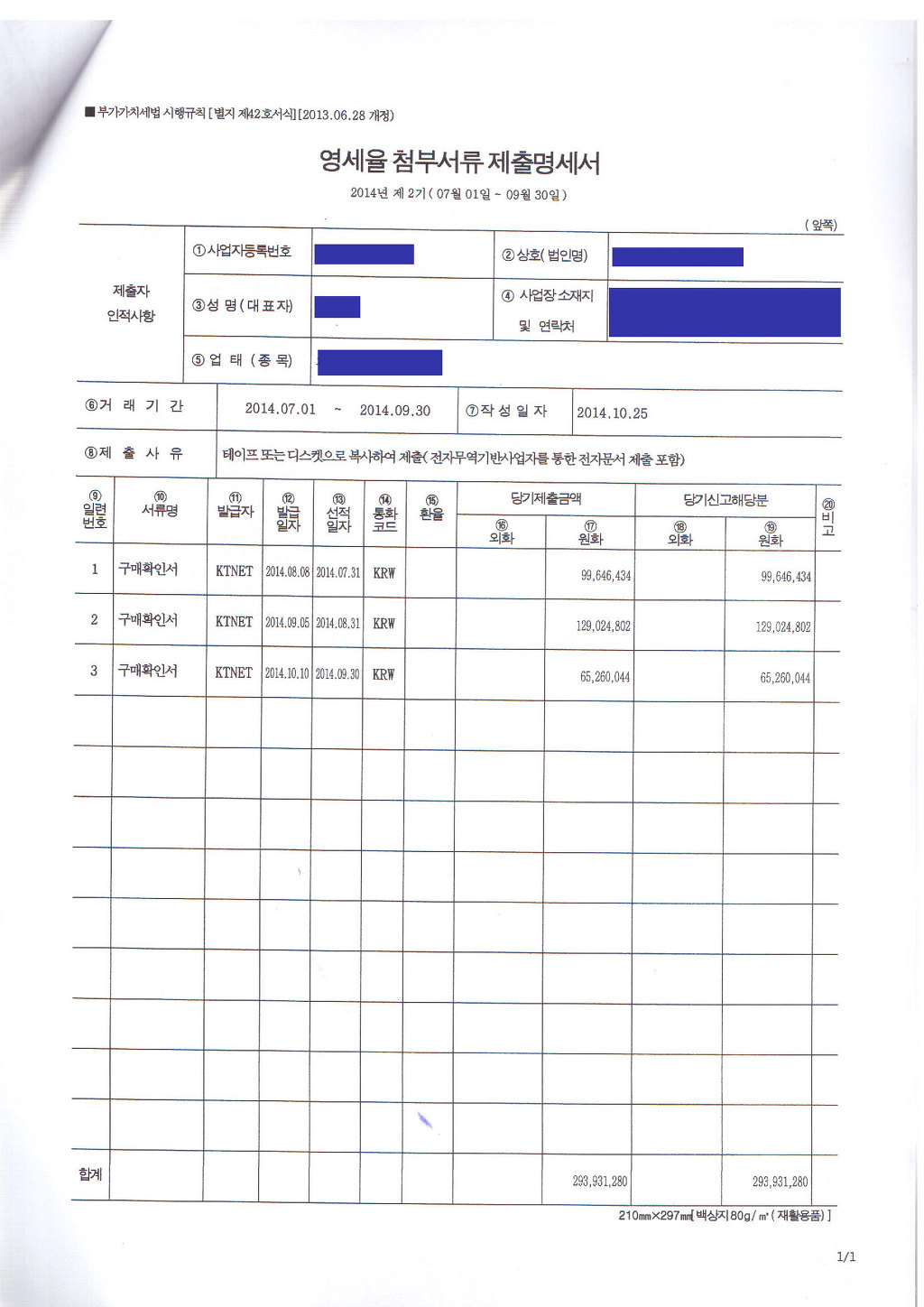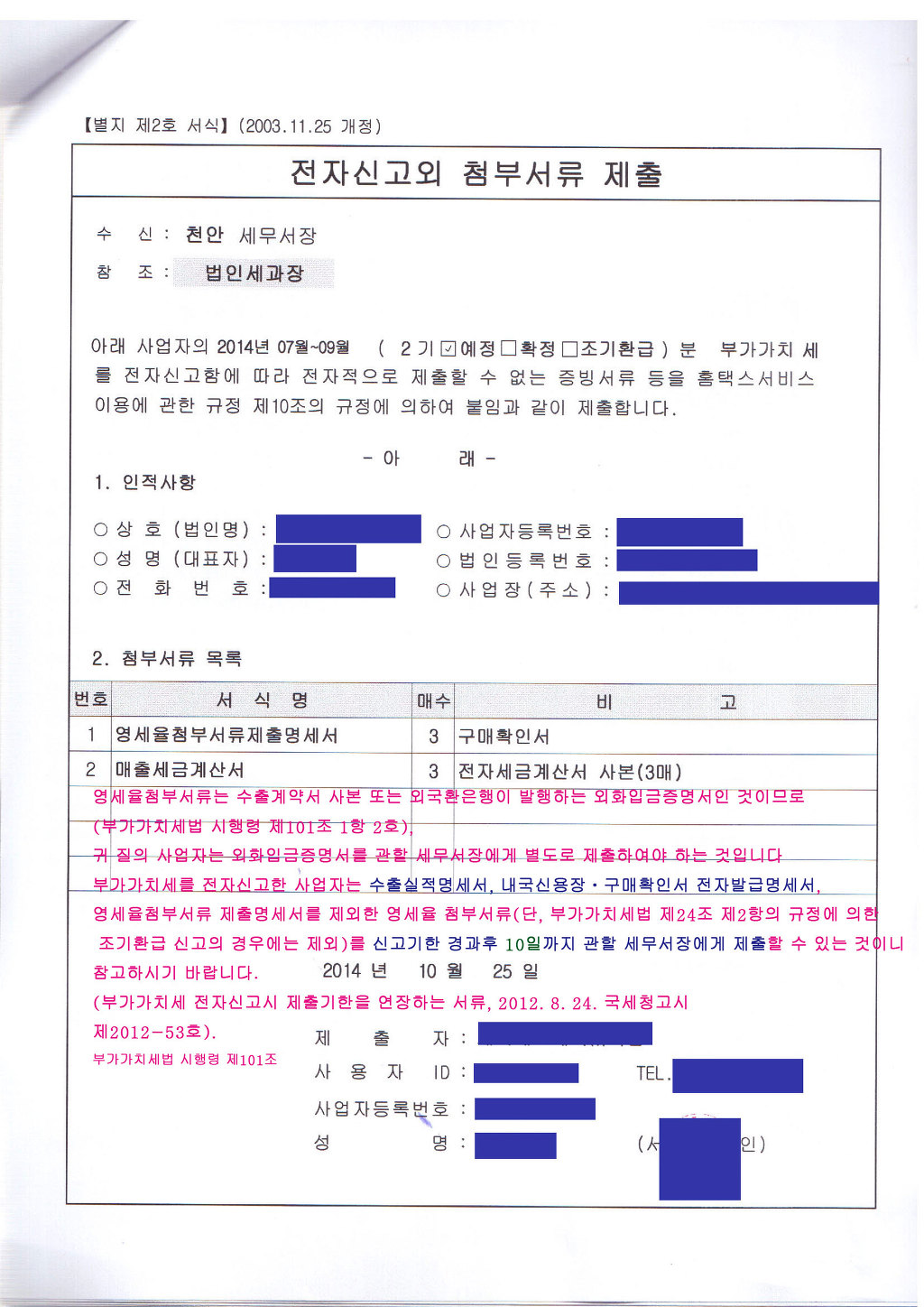 부가가치세를 전자신고한 사업자는 수출실적명세서, 내국신용장ㆍ구매확인서 전자발급명세서, 영세율첨부서류 제출명세서를 제외한 영세율 첨부서류(단, 부가가치세법 제24조 제2항의 규정에 의한 조기환급 신고의 경우에는 제외)를 신고기한 경과후 10일까지 관할 세무서장에게 제출할 수 있는 것이니 참고하시기 바랍니다(부가가치세 전자신고시 제출기한을 연장하는 서류, 2012. 8. 24. 국세청고시 제2012-53호).