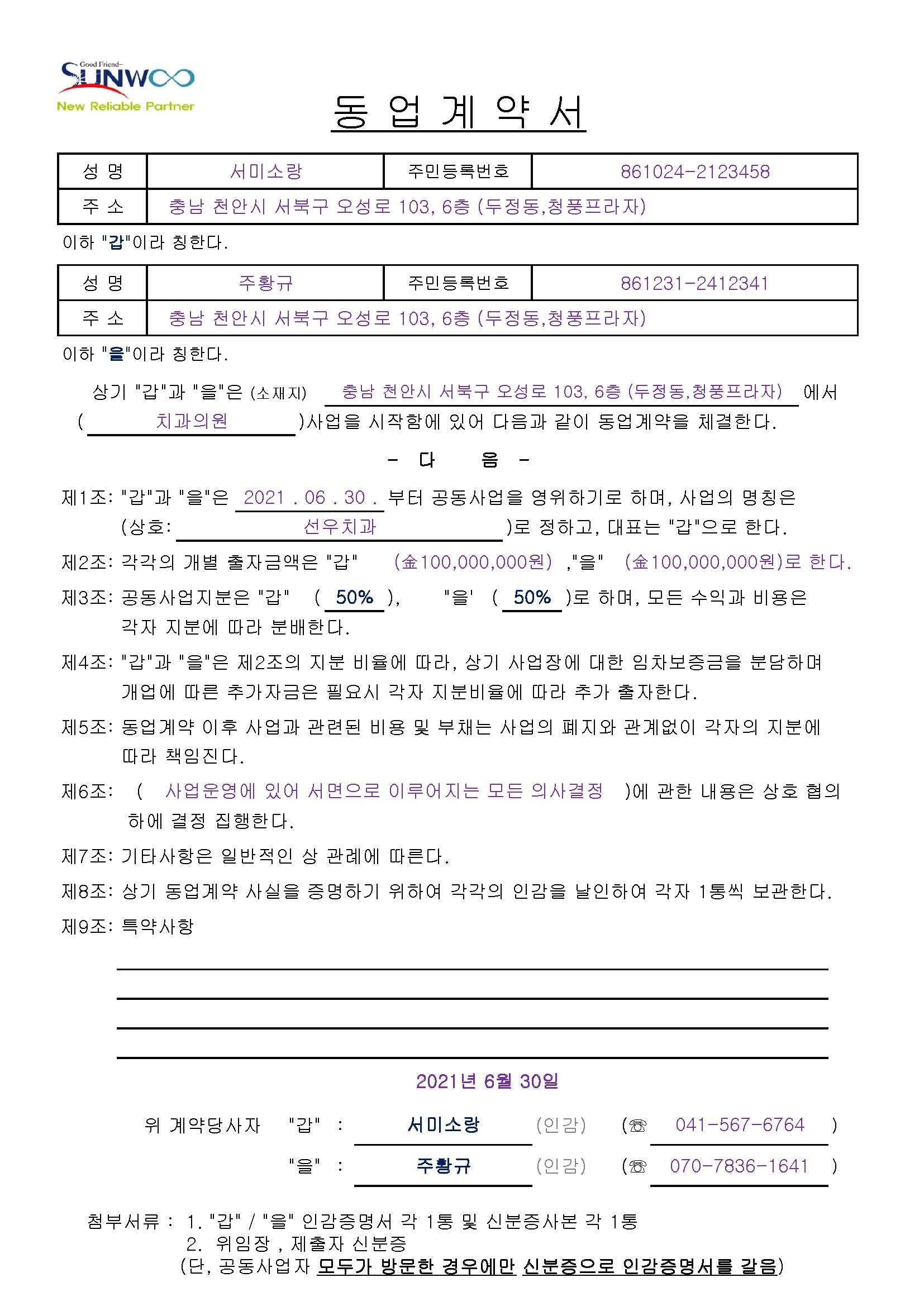 엑셀 - 개인사업자 세무서제출용 동업계약서 동업해지계약서 - 선우회계법인 주황규 2021-06-30 작성자주황규|작성시간21.06.30|조회수808 목록 댓글 0 글자크기 작게가 글자크기 크게가 동업계약서 - 선우회계법인 주황규2021-06-30.pdf112.83KB동업해지계약서- 선우회계법인 주황규2021-06-30.pdf114.05KB동업계약서 동업해지계약서- 선우회계법인 주황규2021-06-30.xlsx66.04KB 동업계약서 양식 무료개인사업자 동업계약서부동산 동업계약서부동산 임대 동업계약서동업 해지 계약서동업계약서 서식공동사업 계약서세무서 동업계약서음식점 동업계약서동업계약서 공증식당 동업계약서동업시 주의사항동업계약서 작성학원 동업계약서서울세무회계 사무소공동사업자 등록 구비서류 첨부파일첨부된 파일이 6개 있습니다. jpg 파일 주황규.jpg 다운로드 jpg 파일 동업계약서 - 선우회계법인 주황규2021-06-30.jpg 다운로드 jpg 파일 동업해지계약서- 선우회계법인 주황규2021-06-30.jpg 다운로드 pdf 파일 동업계약서 - 선우회계법인 주황규2021-06-30.pdf 다운로드 pdf 파일 동업해지계약서- 선우회계법인 주황규2021-06-30.pdf 다운로드 xlsx 파일 동업계약서 동업해지계약서- 선우회계법인 주황규2021-06-30.xlsx 다운로드 다음검색 현재 게시글 추가 기능 열기 북마크 공유하기 신고 센터로 신고 댓글 댓글 0 댓글쓰기 답글쓰기 댓글 리스트