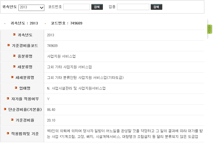 | 기준경비율코드 | 749101 ==> 고용노동부 허가? | |