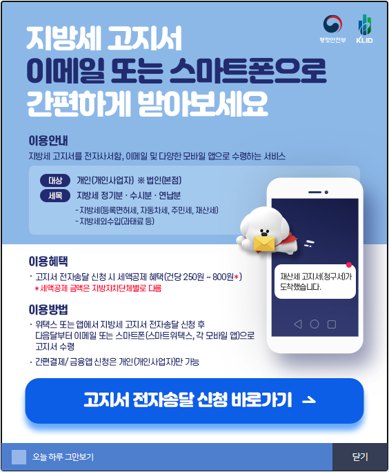 - 지방세(재산세, 주민세, 자동차세, 등록면허세)에 대한 고지서를 전자사서함, 이메일 및 다양한 모바일앱으로 발송하는 서비스입니다.