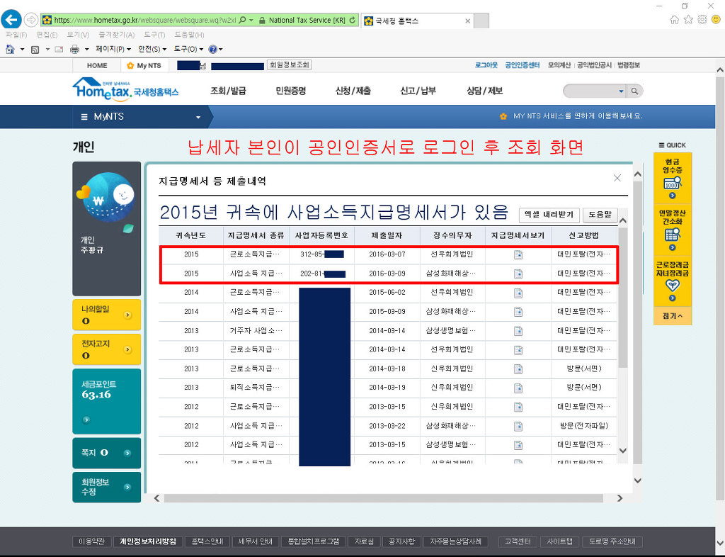납세자 본인 홈택시 공인인증서 로그인 My-NTS 지급명세서 등 제출내역 참조