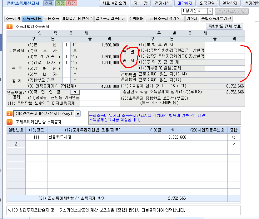 일반신고서는 07. 세액감면.공제.준비금명세서 화면에서 근로소득세액공제의 계산내역 버튼을 클릭하여 근로소득에 상당하는 산출세액을 수동으로 계산(근로소득금액 / 종합소득금액 x 종합소득산출세액)후 특별세액공제(보험료, 의료비, 교육비)를