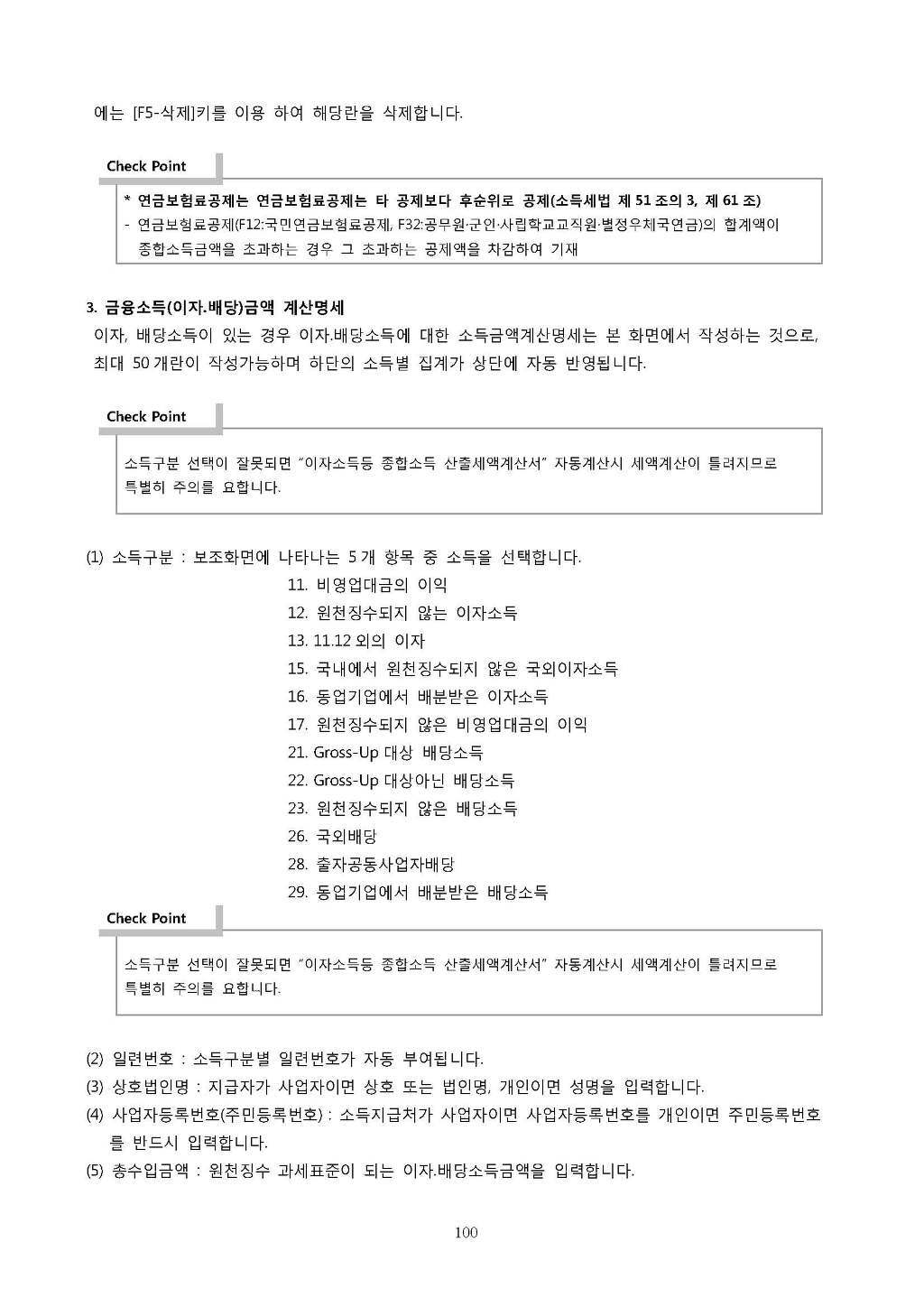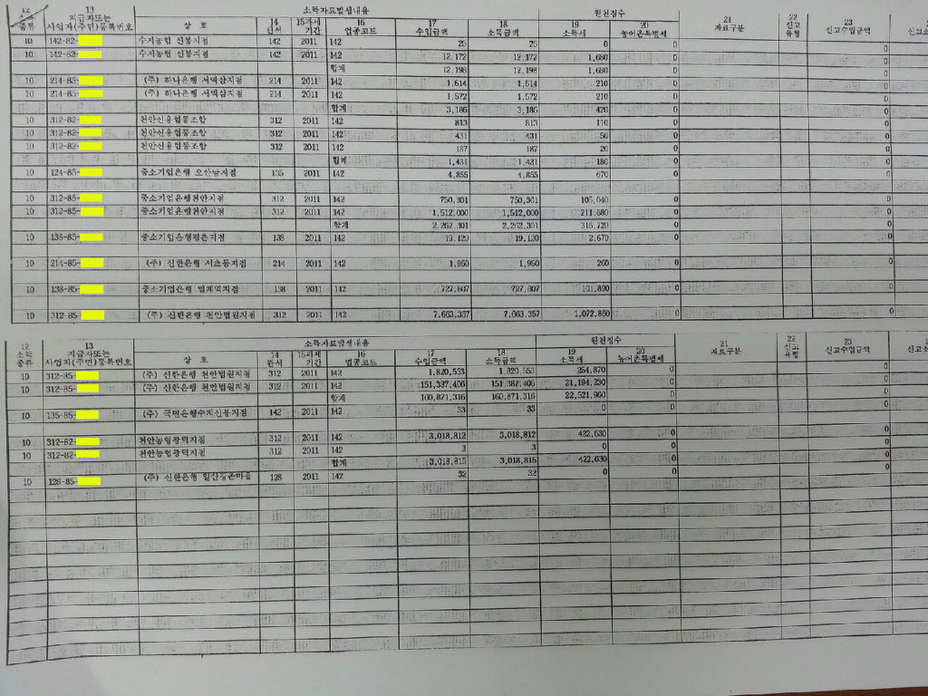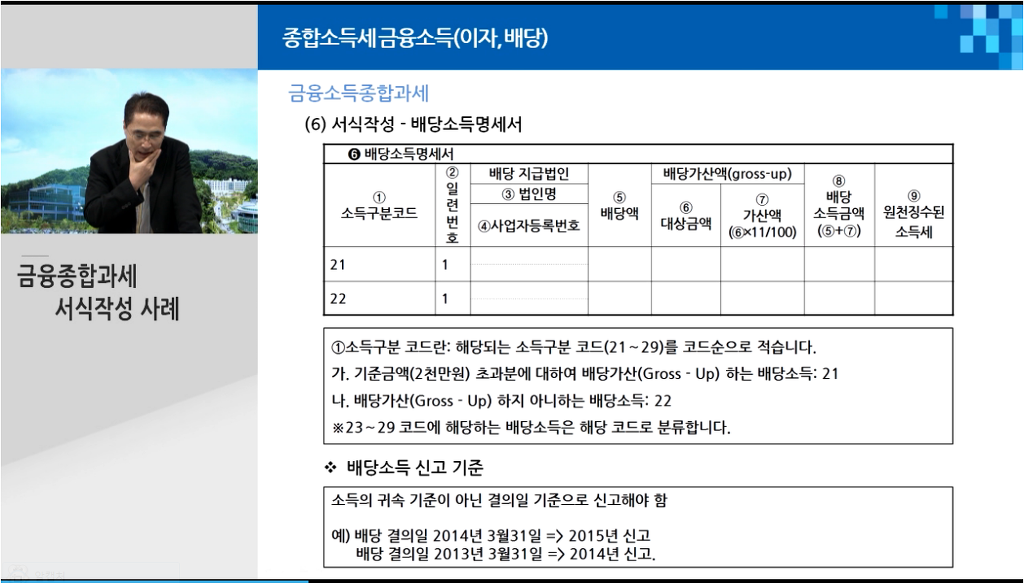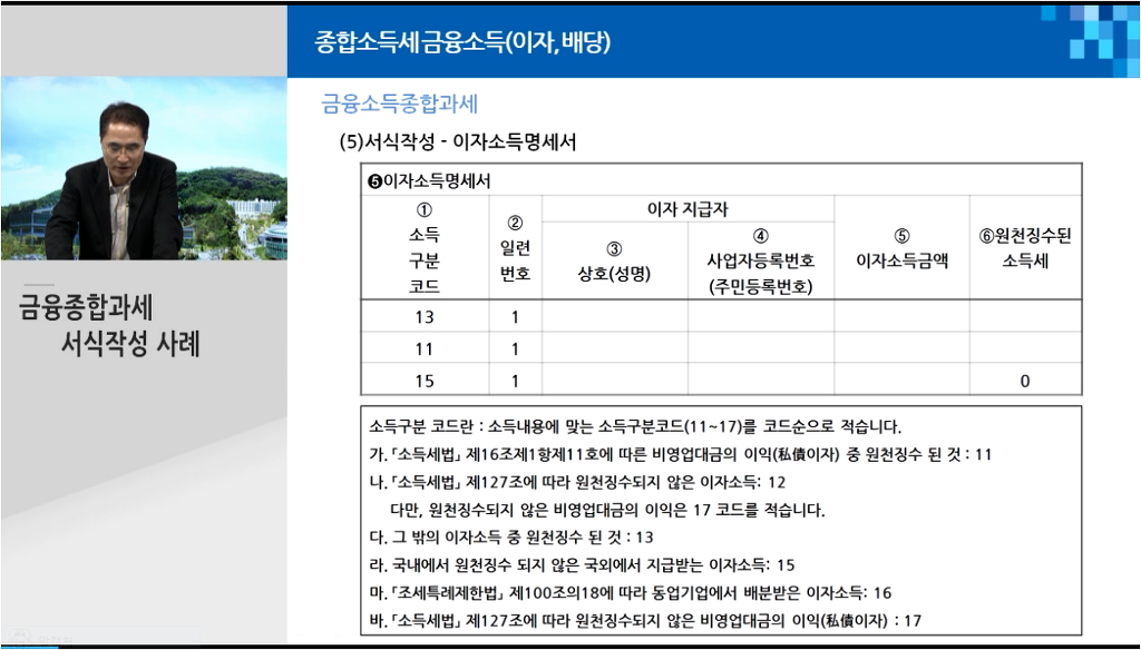 이자소득명세서 작성 (코드번호 입력이 중요) 가. 비영업용대금이자(사채이자) 원천징수된 것 - 원천징수세액 25%짜리는 무조건 11번 코드 (법인 돈 빌려주고 25%) 나. 해당되지 않고 다. 그 밖의 이자소득 중 원천징수 된 것 - 원천징수세액 14% (은행) 13번코드 라. 해외 받은 이자 - 15번 바. 원천징수되지 않은 비영업용대금의 이익 -> 사채이자 (확정신고때는 별로 없지만 사채업자 세무조사), 수정신고하라고 할때 17번코드번호 배당소득 가. 기준 금액 2천만원 초과 배당가산하는 경우 - 21번 코드 (배당소득 원천징수영수증 받으면 거의 무조건 21번) 배당가산율 11% (유리한 제도) 절세효과가 큽니다. 법인세를 물었는데, 배당소득세 이중과세 조정 이미 법인세를 냈으니깐. 나. 배당가산을 하지 않는 배당소득 - 22번 (증권회사에서 구분 표시되어 있으니 그걸 기준으로) 펀드가입한 경우 주주가 아니기 때문에. 지방이전기업,외국계계열회사 법인세 안낸 기업 배당소득세액공제 (배당가산)해 주면 안되겠죠. | ||||||||||||||||||||||
