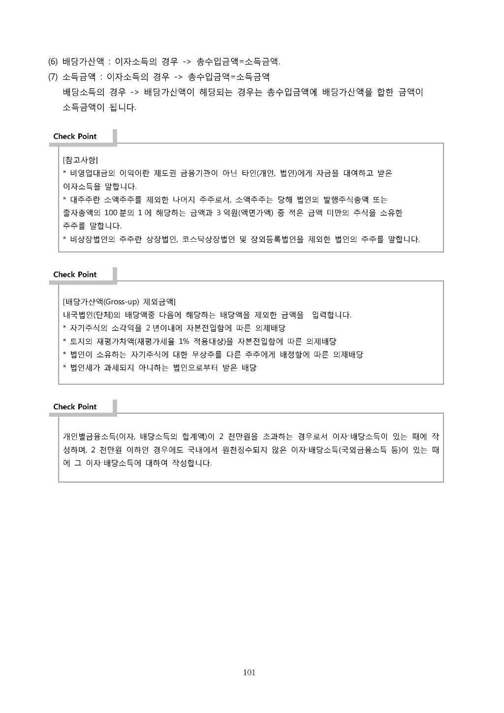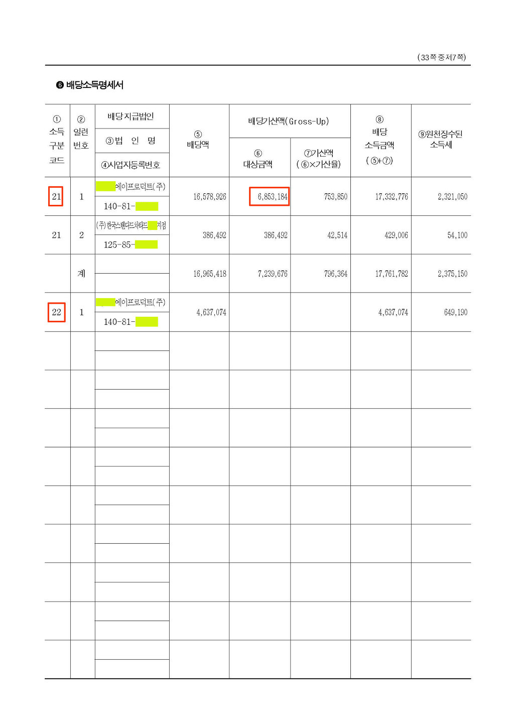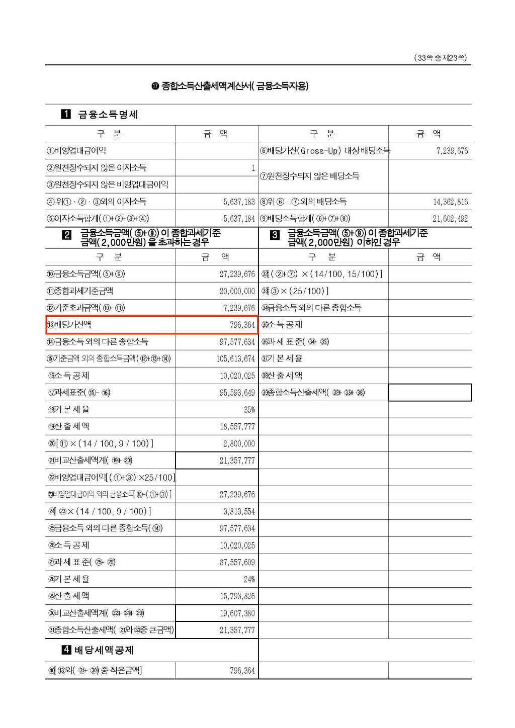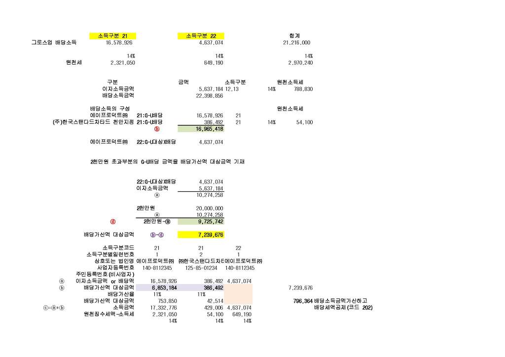 가. 종합과세기준금액(2천만원) 초과분에 대하여 배당가산(Gross-Up) 하는 배당소득: 21