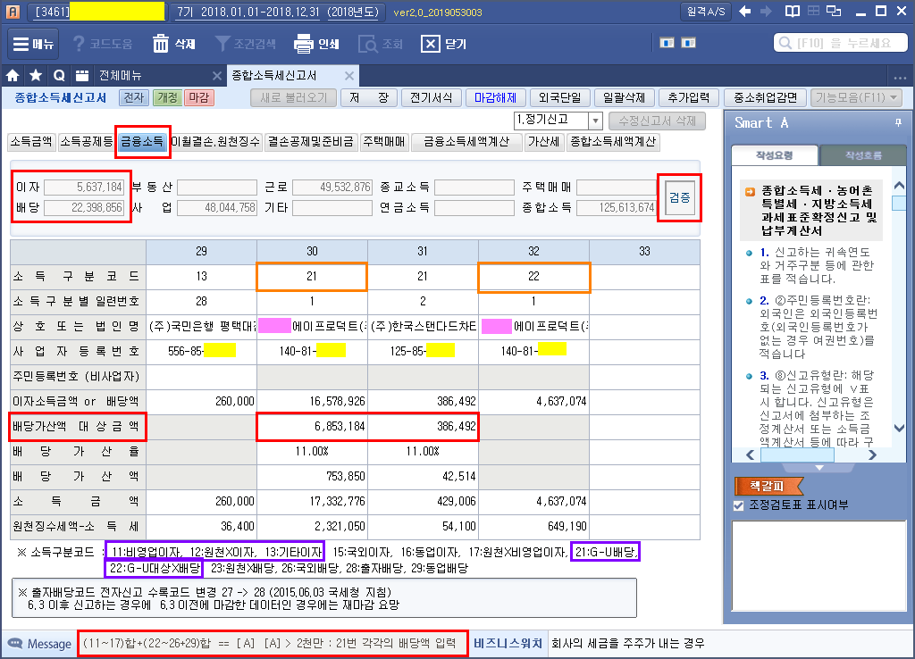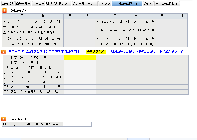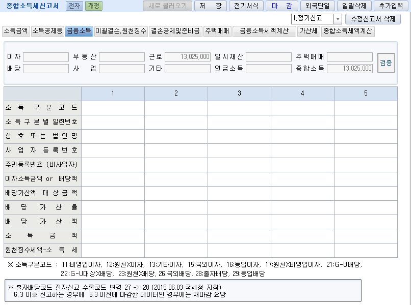 [종합소득세신고서] > 금융소득 탭 상단 '검증' 버튼 클릭하였을때 "금액오류 없음"이 되어야합니다.