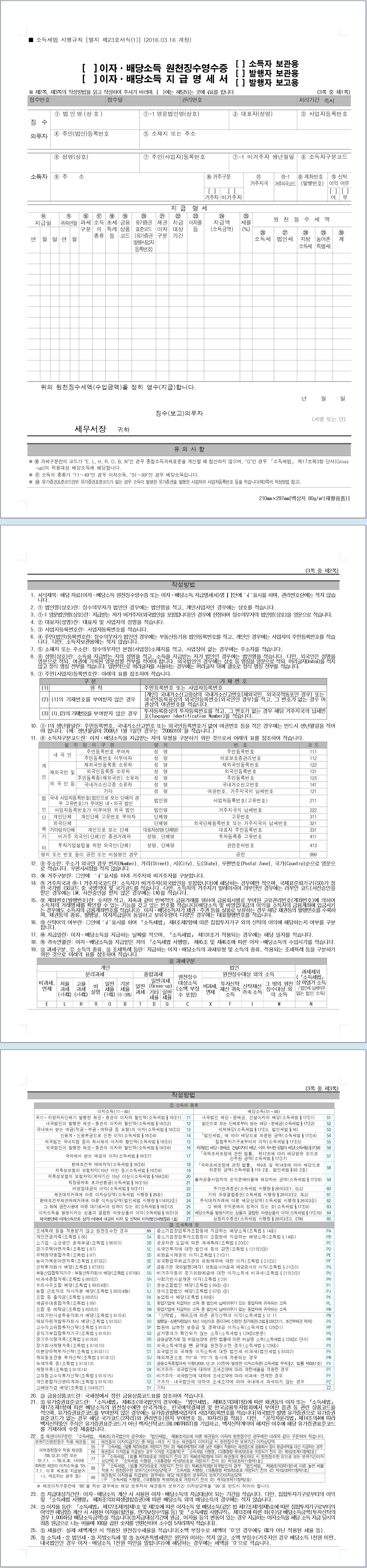 1. 「소득세법」 및 「조세특례제한법」에 따라 비과세 또는 분리과세되는 배당소득은 이 서식의 작성대상에서 제외되며, 개인별 금융소득(이자ㆍ배당소득의 합계액)이 연간 2천만원을 초과하는 경우로서 배당소득이 있는 때에 작성해야 합니다.
