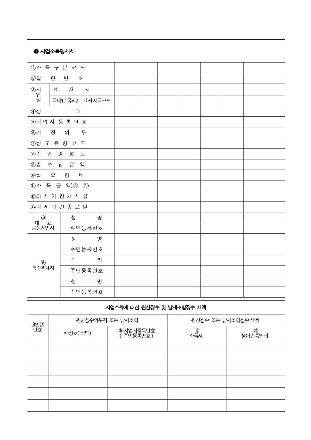 6.⑥ 원천징수된 소득세란: 이자를 지급하는 자에게 원천징수된 소득세를 적습니다. 지방소득세는 제3쪽에서 계산하므로 적지 않습니다.