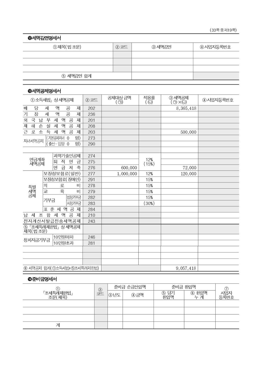 9.⑨ 원천징수된 소득세란: 배당을 지급하는 자에게 원천징수된 소득세를 적습니다. 지방소득세는 제3쪽에서 계산하므로 적지 않습니다.