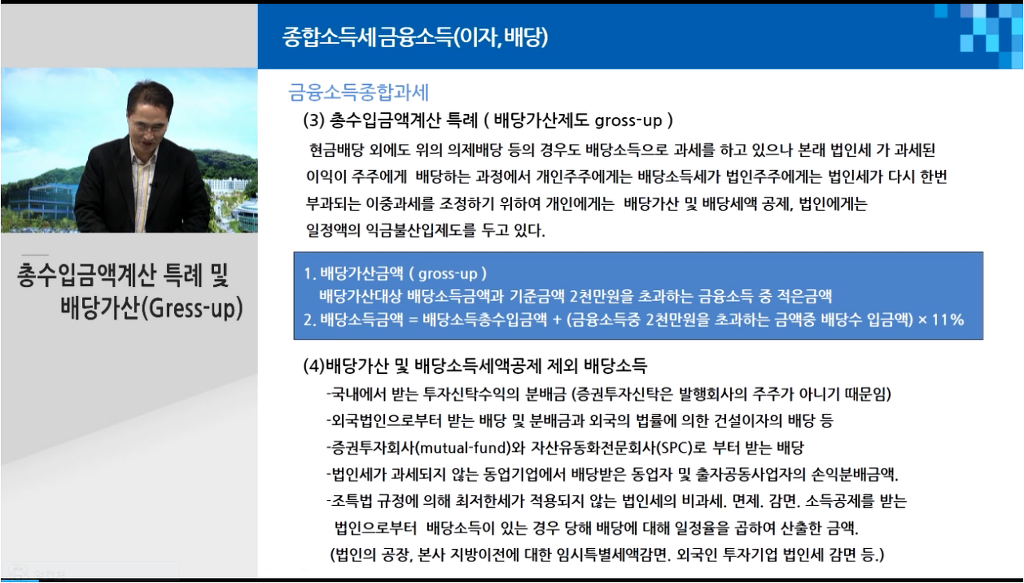 ☞ Gross-up 제도의 취지법인단계에서 이미 법인세가 과세된 소득을 주주에게 배당할 때 그 배당소득에 대하여 다시 과세되는 중복과세문제를 조정하기 위한 제도로 법인단계에서 과세된 법인세(Gross-up 금액)을 배당소득총수입금액에 가산하여 배당소득금액을 계산한 후 그 Gross-up금액을 다시 배당세액공제로 산출세액에서 차감함으로써 중복과세문제를 조정한다.