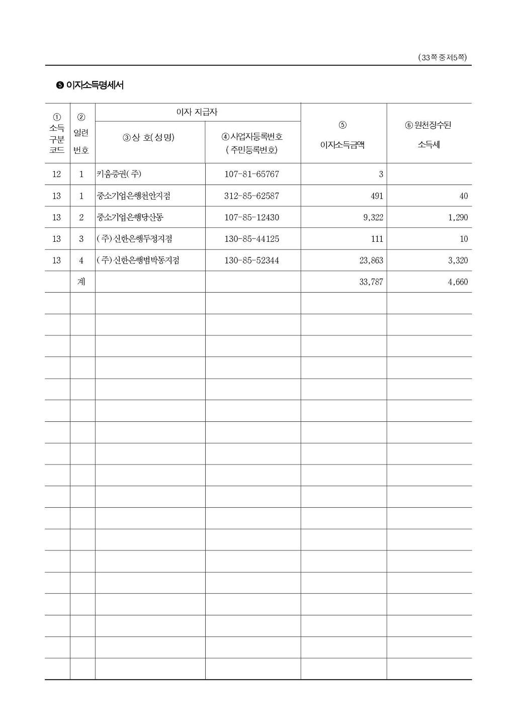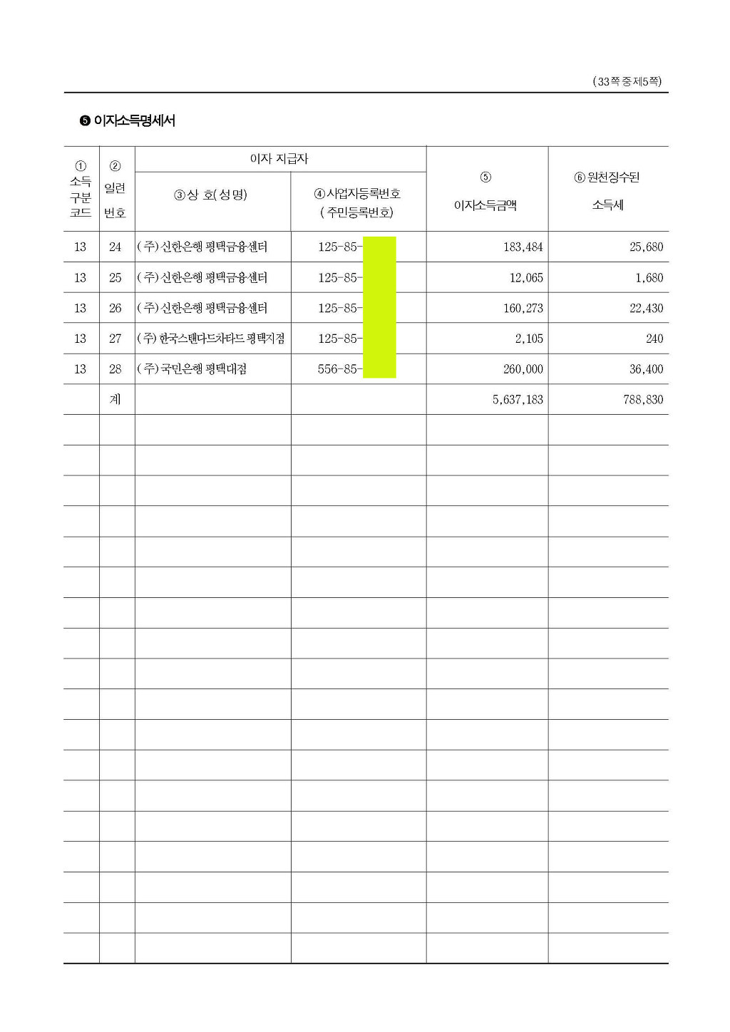 5. ⑤ 이자소득금액란: 이자의 지급자별로 원천징수세액을 차감하기 전의 총 이자액을 적습니다.