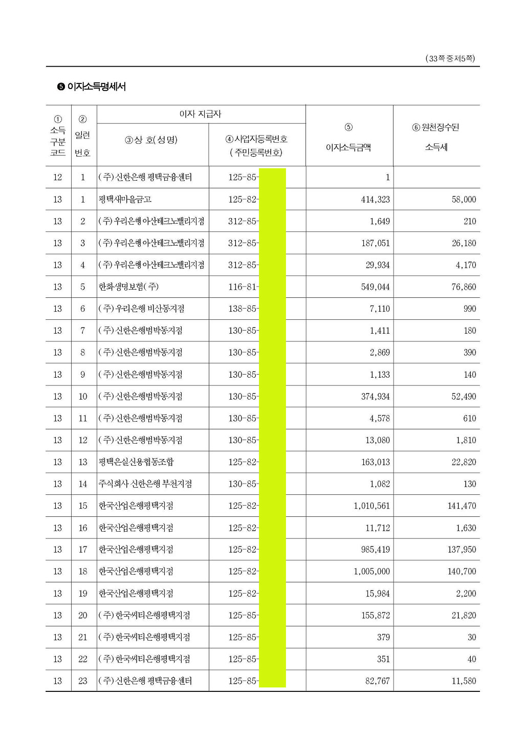다. 그 밖의 이자소득 중 원천징수 된 것: 13