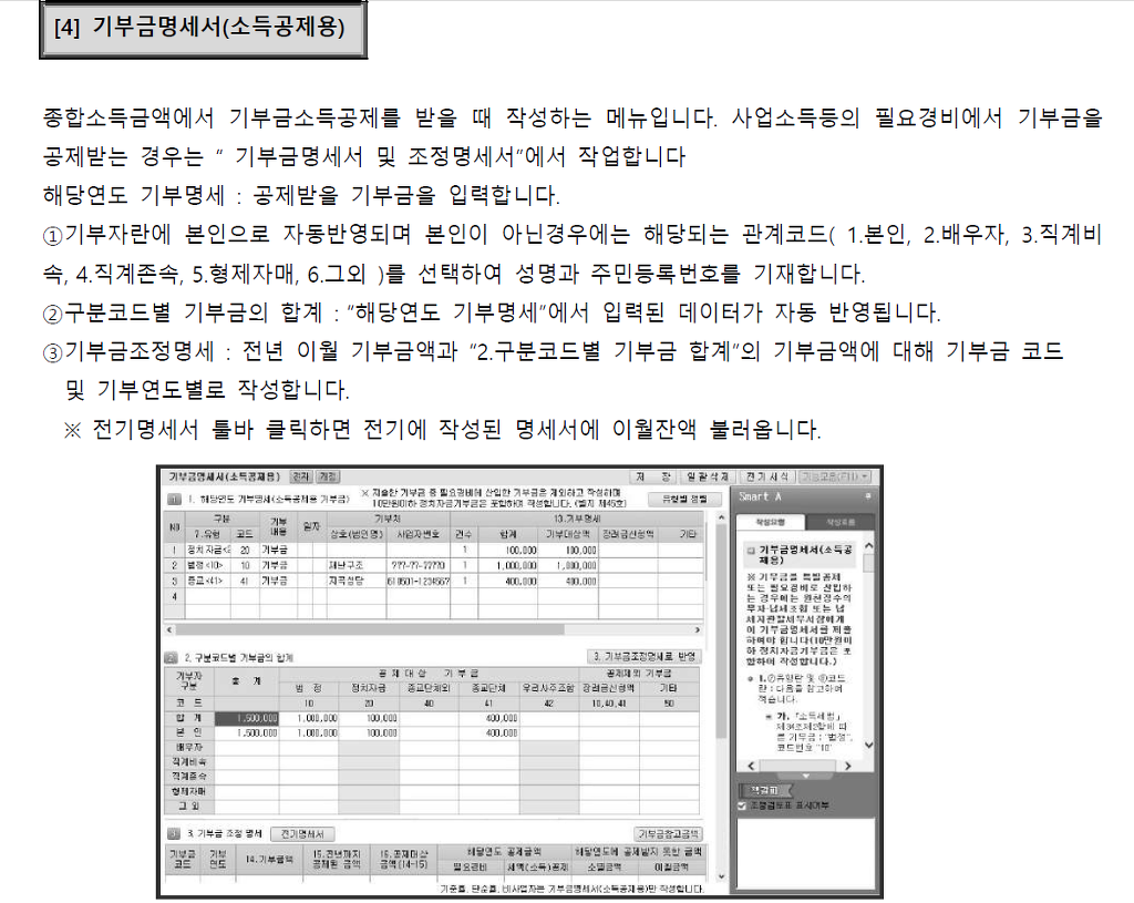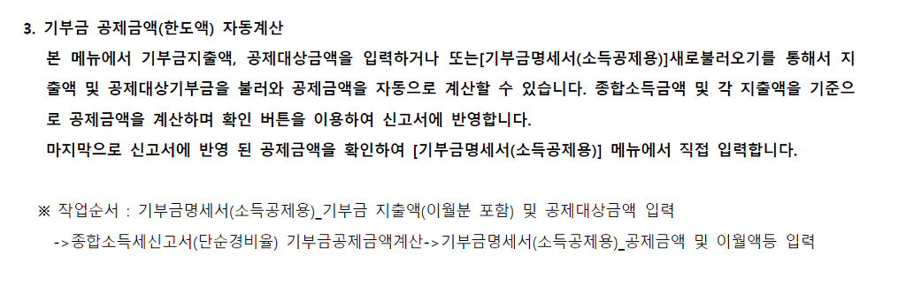 12. ‘4. 기부금 조정 명세’ 작성 방법 가. 전년 이월 기부금액과 ‘3. 구분코드별 기부금 합계’의 기부금액에 대해 기부금코드 및 기부연도별로 작성하며 해당 연도 공제금액 및 이월금액(소멸금액)을 계산합니다. 나. 공제받지 못한 기부금 중 이월가능 기간이 지난 기부금에 대해서는 소멸금액란에 적습니다. 다. 근로소득자가 원천징수의무자에게 제출하는 기부금명세서는 기부금코드, 기부연도, ⑰ 기부금액, ⑱ 전년까지 공제된 금액, ⑱ 공제대상금액까지 작성할 수 있습니다. 라. 전년도에 이월된 기부금액에 대해 공제를 받으려는 근로소득자는 전년도의 기부금명세서를 제출해야 합니다(계속근로 등으로 인해 원천징수의무자가 변동이 없는 경우 제출하지 아니할 수 있습니다). 마. 2013.12.31.이전 지출 기부금 중 이월된 기부금은 해당 과세기간에 지출한 기부금보다 먼저 공제합니다. 바. 기부금 한도를 초과하는 경우 기부금에 대해서는 기부연도가 빠른 기부금부터 공제를 적용합니다. 사. 종교단체 지정기부금과 종교단체 외 지정기부금이 함께 있는 경우 우선 종교단체 외 지정기부금부터 공제합니다. 아. 다음 연도로 이월된 기부금은 해당 과세기간 이후 기본공제대상자의 변동에 영향을 받지 않습니다. |