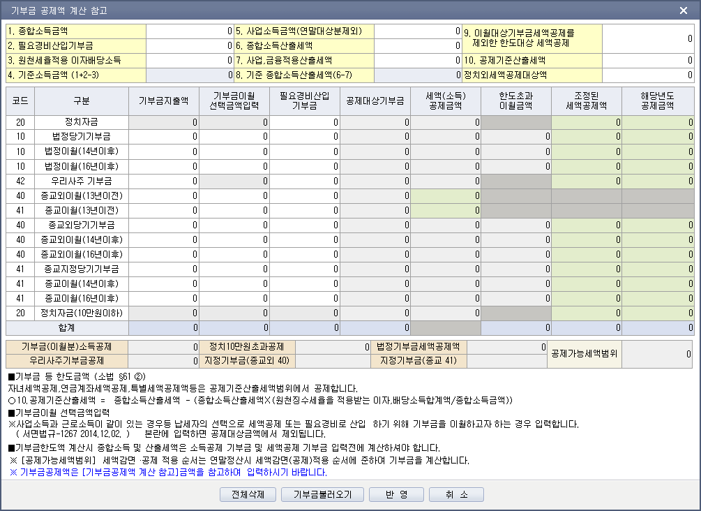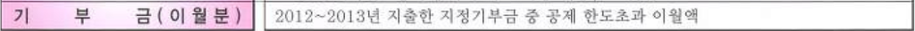 1. 「조세특례제한법」 제76조에 따른 기부금(이하 이 항에서 "정치자금기부금"이라 한다) 또는 법정기부금의 경우에는 다음 계산식에 따라 계산한 금액(2013.02.15 개정)