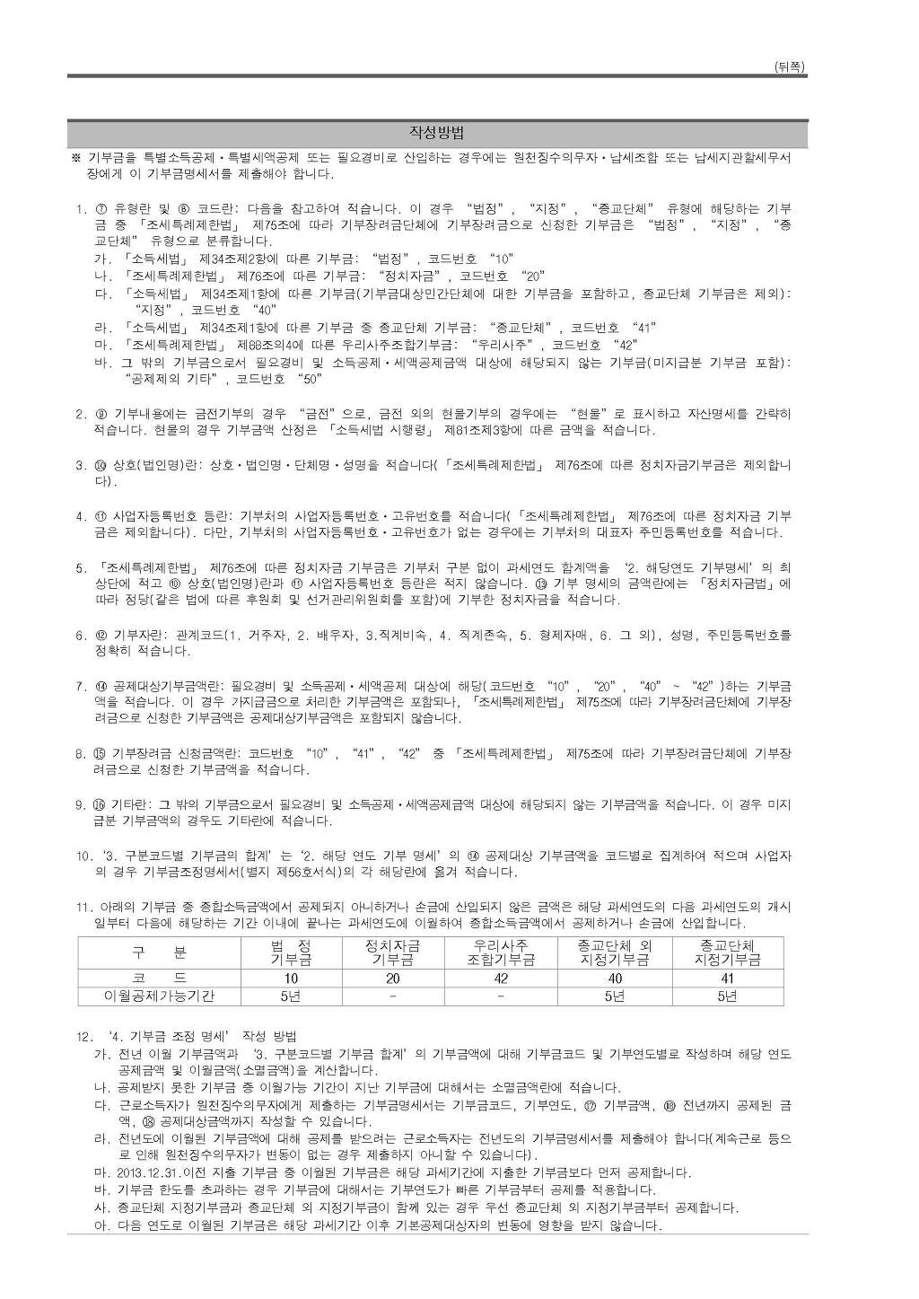 1. ⑦ 유형란 및 ⑧ 코드란: 다음을 참고하여 적습니다. 이 경우 “법정”, “지정”, “종교단체” 유형에 해당하는 기부금 중 「조세특례제한법」 제75조에 따라 기부장려금단체에 기부장려금으로 신청한 기부금은 “법정”, “지정”, “종교단체” 유형으로 분류합니다. 가. 「소득세법」 제34조제2항에 따른 기부금: “법정”, 코드번호 “10” 나. 「조세특례제한법」 제76조에 따른 기부금: “정치자금”, 코드번호 “20” 다. 「소득세법」 제34조제1항에 따른 기부금(기부금대상민간단체에 대한 기부금을 포함하고, 종교단체 기부금은 제외): “지정”, 코드번호 “40” 라. 「소득세법」 제34조제1항에 따른 기부금 중 종교단체 기부금: “종교단체”, 코드번호 “41” 마. 「조세특례제한법」 제88조의4에 따른 우리사주조합기부금: “우리사주”, 코드번호 “42” 바. 그 밖의 기부금으로서 필요경비 및 소득공제ㆍ세액공제금액 대상에 해당되지 않는 기부금(미지급분 기부금 포함): “공제제외 기타”, 코드번호 “50”