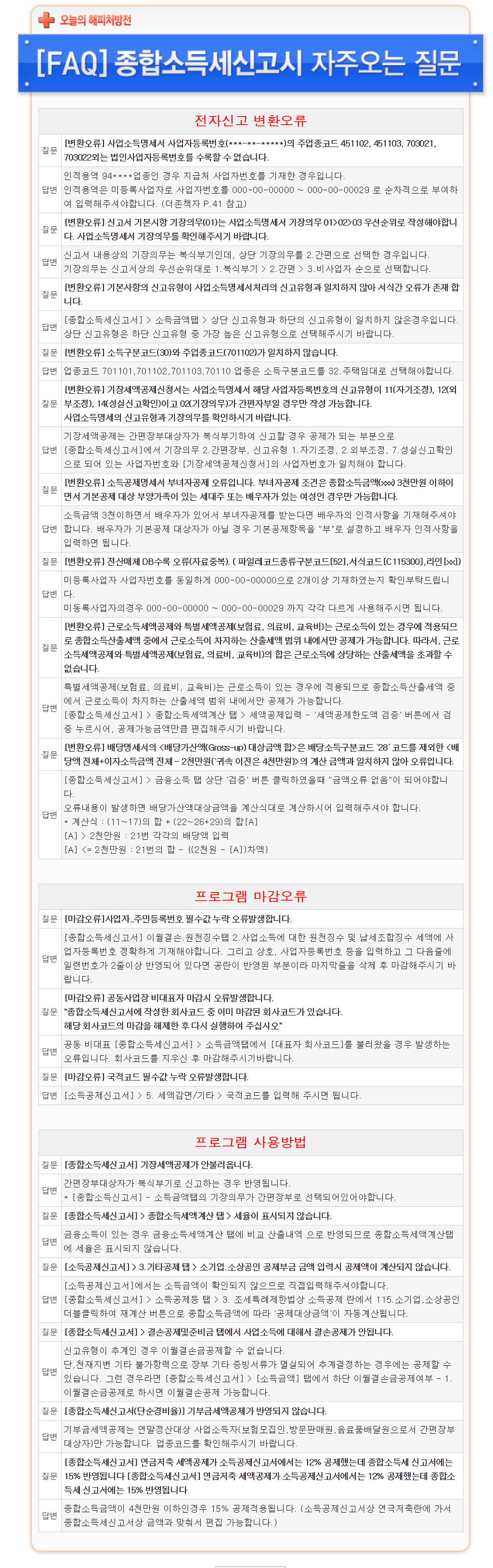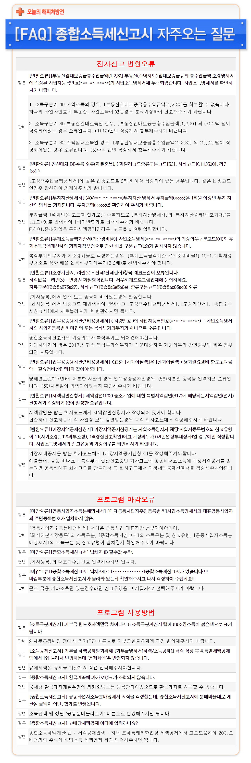 | 전자신고 변환오류 | | 질문 | [변환오류] 사업소득명세서 사업자등록번호(***-**-*****)의 주업종코드 451102, 451103, 703021, 703022외는 법인사업자등록번호를 수록할 수 없습니다. | | 답변 | 인적용역 94****업종인 경우 지급처 사업자번호를 기재한 경우입니다. 인적용역은 미등록사업자로 사업자번호를 000-00-00000 ~ 000-00-00029 로 순차적으로 부여하여 입력해주셔야합니다. (더존책자 P.41 참고) | | 질문 | [변환오류] 신고서 기본시항 기장의무(01)는 사업소득명세서 기장의무 01>02>03 우선순위로 작성해야합니다. 사업소득명세서 기장의무를 확인해주시기 바랍니다. | | 답변 | 신고서 내용상의 기장의무는 복식부기인데, 상단 기장의무를 2.간편으로 선택한 경우입니다. 기장의무는 신고서상의 우선순위대로 1.복식부기 > 2.간편 > 3.비사업자 순으로 선택합니다. | | 질문 | [변환오류] 기본사항의 신고유형이 사업소득명세서처리의 신고유형과 일치하지 않아 서식간 오류가 존재 합니다. | | 답변 | [종합소득세신고서] > 소득금액탭 > 상단 신고유형과 하단의 신고유형이 일치하지 않은경우입니다. 상단 신고유형은 하단 신고유형 중 가장 높은 신고유형으로 선택해주시기 바랍니다. | | 질문 | [변환오류] 소득구분코드(30)와 주업종코드(701102)가 일치하지 않습니다. | | 답변 | 업종코드 701101,701102,701103,70110 업종은 소득구분코드를 32.주택임대로 선택해야합니다. | | 질문 | [변환오류] 기장세액공제신청서는 사업소득명세서 해당 사업자등록번호의 신고유형이 11(자기조정), 12(외부조정), 14(성실신고확인)이고 02(기장의무)가 간편자부일 경우만 작성 가능합니다. 사업소득명세의 신고유형과 기장의무를 확인하시기 바랍니다. | | 답변 | 기장세액공제는 간편장부대상자가 복식부기하여 신고할 경우 공제가 되는 부분으로 [종합소득세신고서]에서 기장의무 2.간편장부, 신고유형 1.자기조정, 2.외부조정, 7.성실신고확인 으로 되어 있는 사업자번호와 [기장세액공제신청서]의 사업자번호가 일치해야 합니다. | | 질문 | [변환오류] 소득공제명세서 부녀자공제 오류입니다. 부녀자공제 조건은 종합소득금액(xxx) 3천만원 이하이면서 기본공제 대상 부양가족이 있는 세대주 또는 배우자가 있는 여성인 경우만 가능합니다. | | 답변 | 소득금액 3천이하면서 배우자가 있어서 부녀자공제를 받는다면 배우자의 인적사항을 기재해주셔야합니다. 배우자가 기본공제 대상자가 아닐 경우 기본공제항목을 "부"로 설정하고 배우자 인적사항을 입력하면 됩니다. | | 질문 | [변환오류] 전산매체 DB수록 오류(자료중복). ( 파일레코드종류구분코드[52],서식코드[C115300],라인[xx]) | | 답변 | 미등록사업자 사업자번호를 동일하게 000-00-00000으로 2개이상 기재하였는지 확인부탁드립니다. 미동록사업자의경우 000-00-00000 ~ 000-00-00029 까지 각각 다르게 사용해주시면 됩니다. | | 질문 | [변환오류] 근로소득세액공제와 특별세액공제(보험료, 의료비, 교육비)는 근로소득이 있는 경우에 적용되므로 종합소득산출세액 중에서 근로소득이 차지하는 산출세액 범위 내에서만 공제가 가능합니다. 따라서, 근로소득세액공제와 특별세액공제(보험료, 의료비, 교육비)의 합은 근로소득에 상당하는 산출세액을 초과할 수 없습니다. | | 답변 | 특별세액공제(보험료, 의료비, 교육비)는 근로소득이 있는 경우에 적용되므로 종합소득산출세액 중에서 근로소득이 차지하는 산출세액 범위 내에서만 공제가 가능합니다. [종합소득세신고서] > 종합소득세액계산 탭 > 세액공제입력 - '세액공제한도액 검증' 버튼에서 검증 누르시어, 공제가능금액만큼 편집해주시기 바랍니다. | | 질문 | [변환오류] 배당명세서의 <배당가산액(Gross-up) 대상금액 합>은 배당소득구분코드 ‘28’ 코드를 제외한 <배당액 전체+이자소득금액 전체 - 2천만원(`귀속 이전은 4천만원)>의 계산 금액과 일치하지 않아 오류입니다. | | 답변 | [종합소득세신고서] > 금융소득 탭 상단 '검증' 버튼 클릭하였을때 "금액오류 없음"이 되어야합니다. 오류내용이 발생하면 배당가산액대상금액을 계산식대로 계산하시어 입력해주셔야 합니다. * 계산식 : (11~17)의 합 + (22~26+29)의 합[A] [A] > 2천만원 : 21번 각각의 배당액 입력 [A] <= 2천만원 : 21번의 합 - {(2천원 - [A])차액} |