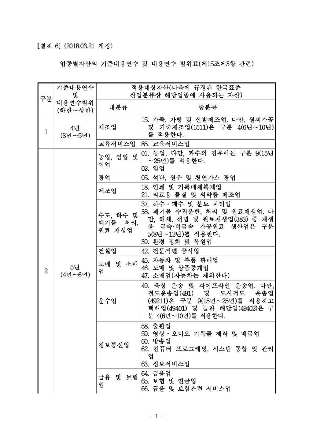 업종별자산의 기준내용연수 및 내용연수 범위표(제15조제3항 관련) 2018.03.21. 개정.hwp