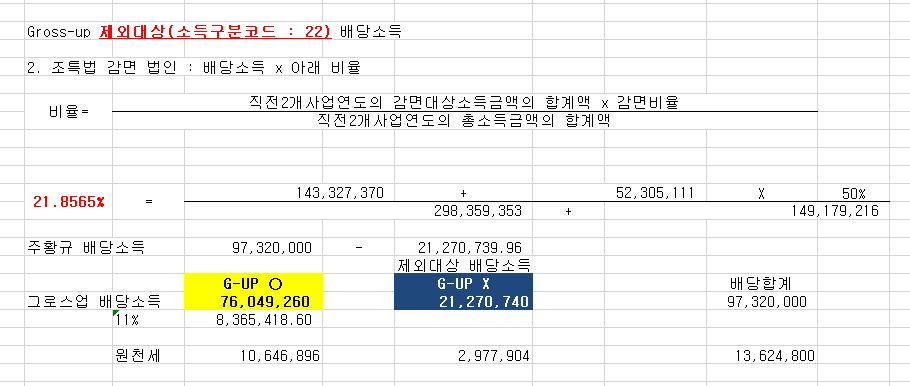 1. 배당세액공제액 = 배당가산액(Gross-Up) 대상 배당액 중 금융소득 2천만원 초과하는 부분 × 배당가산율 주1)