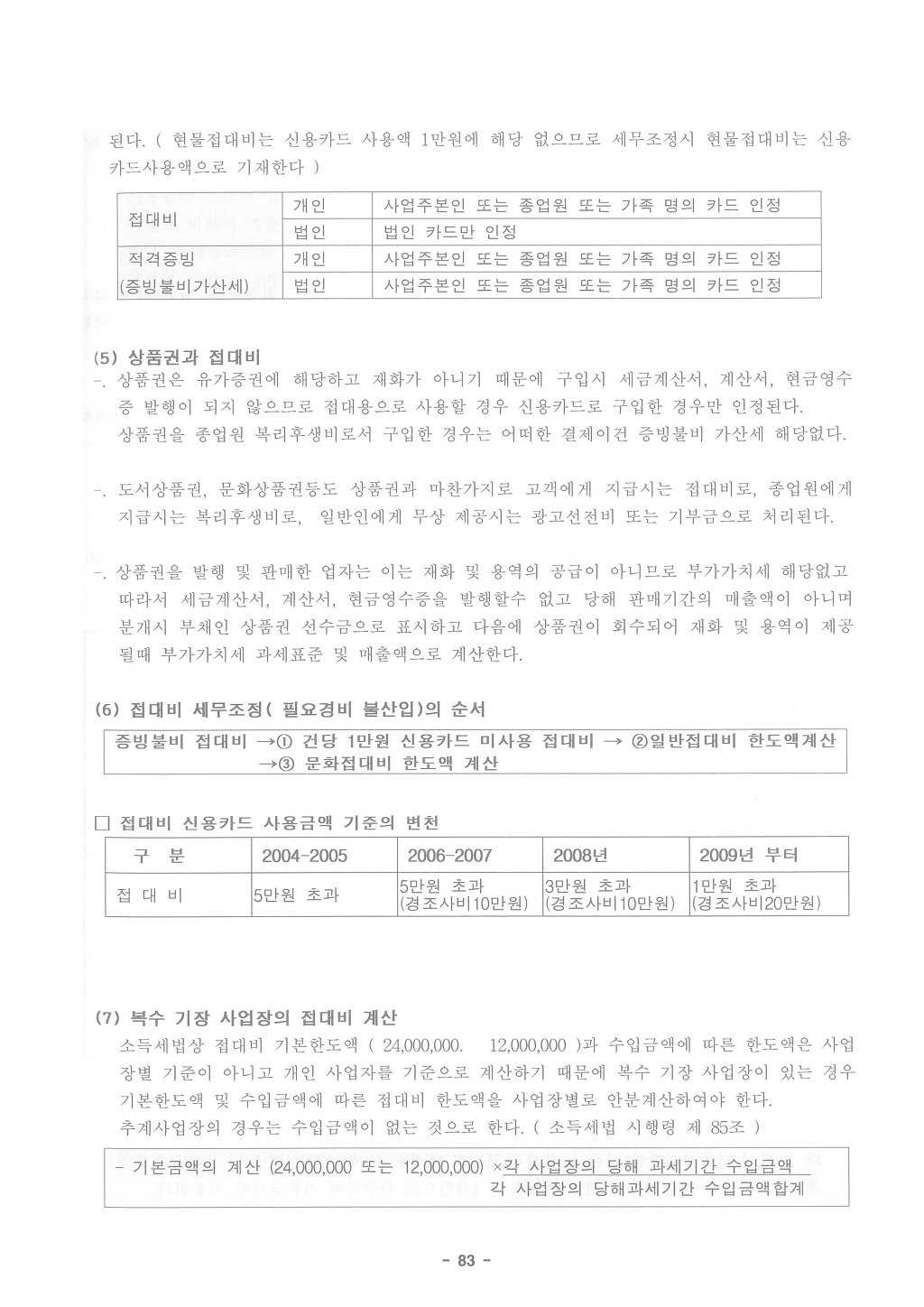 소득세법상 접대비 기본한도액 (24,000,000 또는 12,000,000)과 수입금액에 따른 한도액은 사업장별 기준이 아니고 개인 사업자를 기준으로 계산하기 때문에 복수 기장 사업장이 있는 경우 기본한도액 및 수입금액에 따른 접대비 한도액을 사업장별로 안분계산하여야 한다.