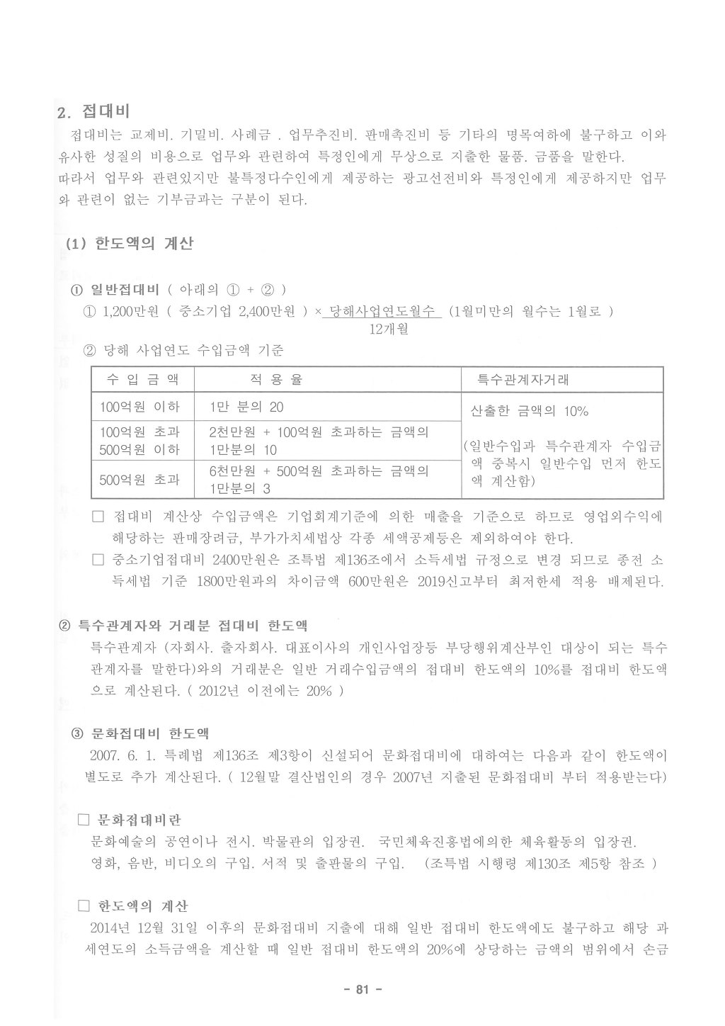 ① 삭제(2005.12.31) | ① 중소기업이 지출한 접대비로서 「법인세법」 제25조 제1항 및 「소득세법」 제35조 제1항에 따라 접대비를 손금 또는 필요경비에 산입하지 아니하는 금액을 계산할 때 다음 각 호의 구분에 따른 금액은 2018년 12월 31일이 속하는 사업연도까지는 2천400만원에 해당 사업연도의 월수를 곱하고 이를 12로 나누어 산출한 금액으로 한다.(2016.12.20 신설)