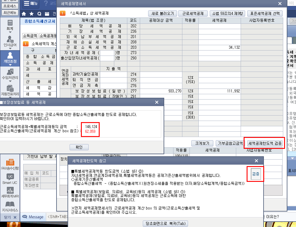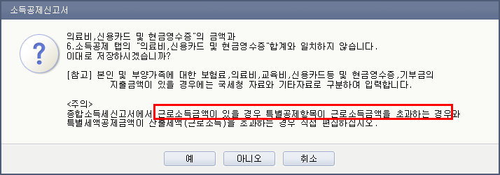 귀하가 소득공제 명세서상 조세특례제한법상 소득공제 명세에 신용카드 등 사용금액을 기재하더라도 이는 근로소득금액(차감소득금액)에서만 공제되어야 합니다.
