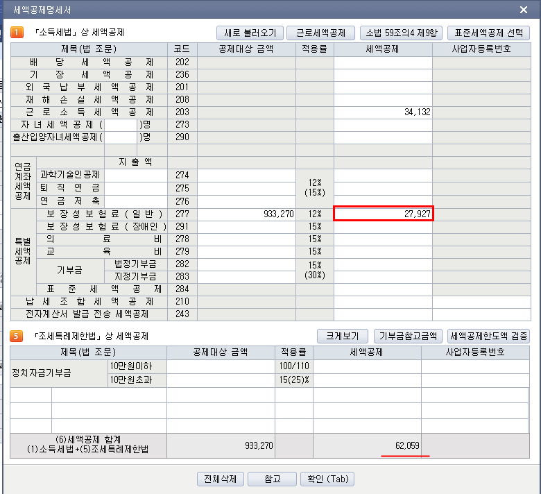 "소득공제명세서" 상의 "조세특례제한법상 소득공제'에서 공제 가능한가요?