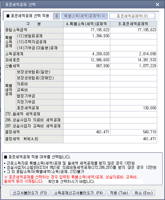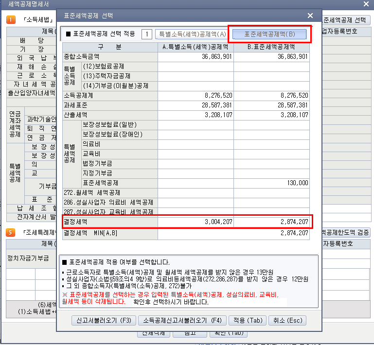 표준세액공제 - 12만원(성실사업자) ,13만원(max근로소득,특별), 7만원(성실신고확인포함) 종합소득세 신고서 세액공제명세서 - (표준세액공제액(B)) CHECK!