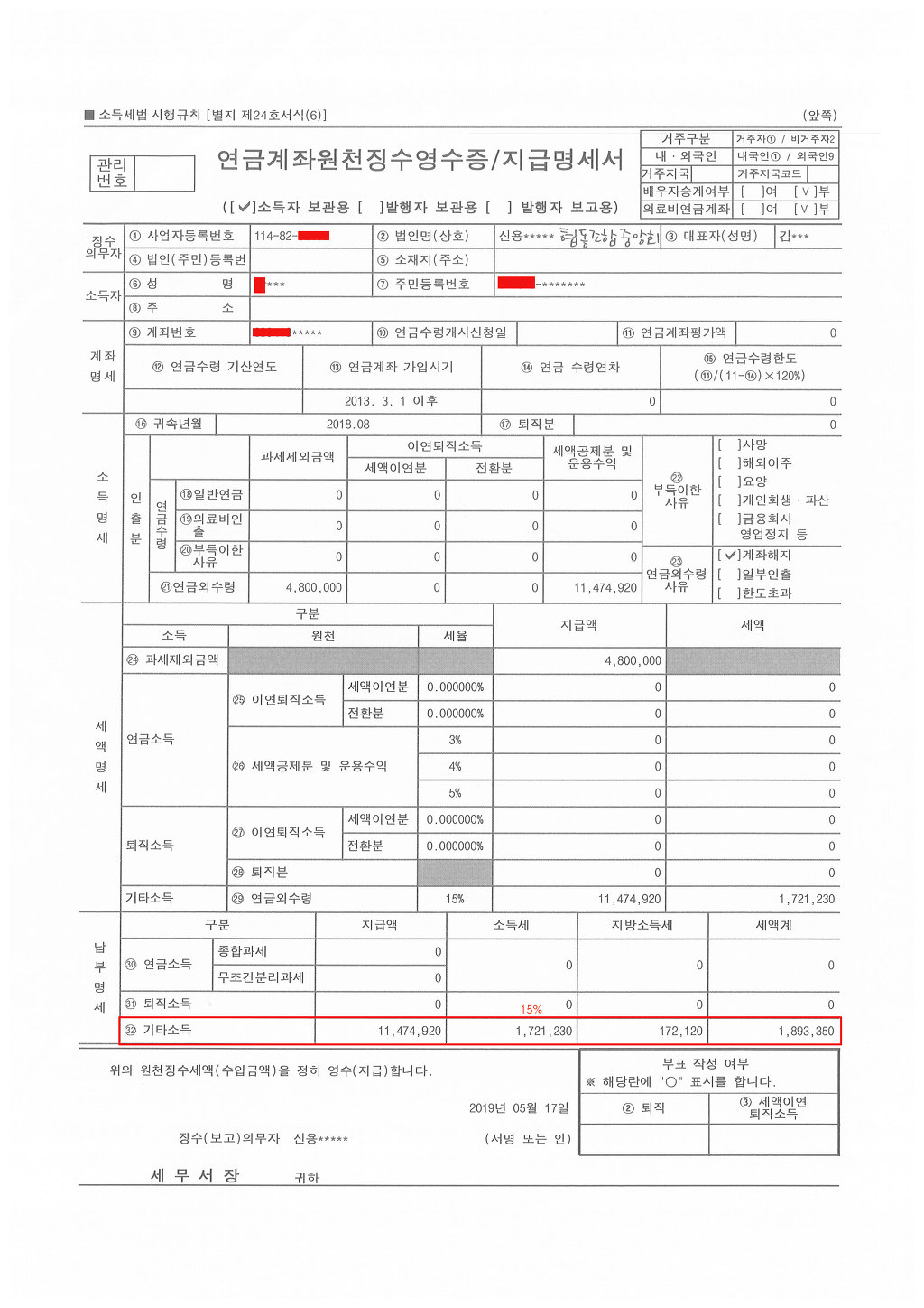 연금계좌(보험회사) 해지로 기타소득으로 각각 9,976,560원과 30,809,451원이 발생했습니다.
