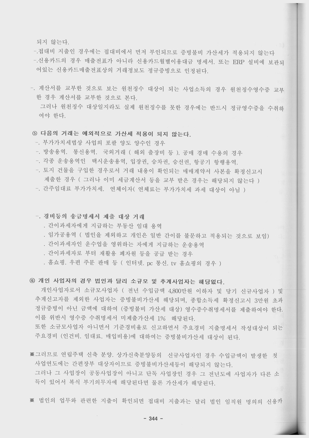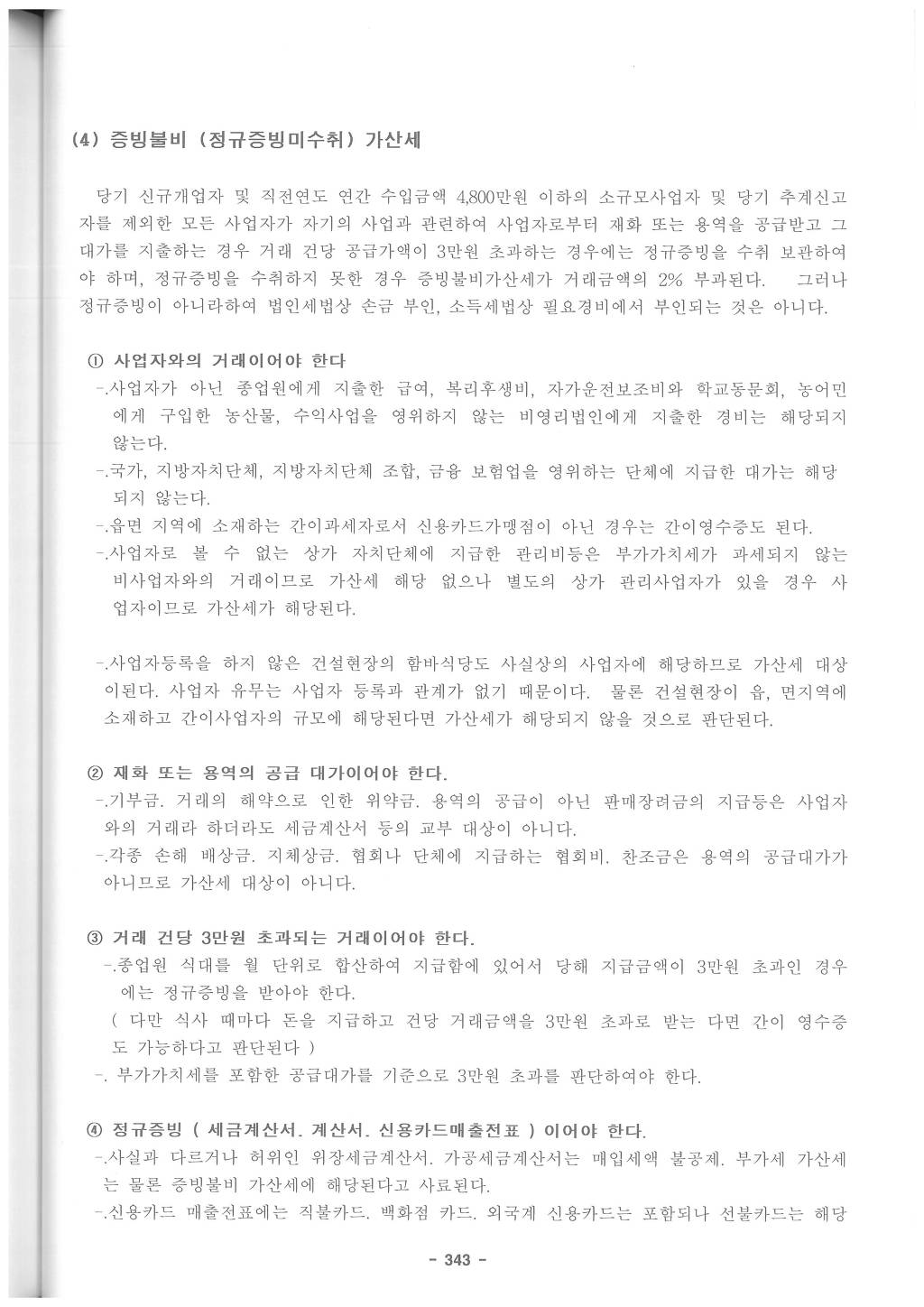 ④ 사업자(대통령령[소득세법시행령 제147조의 2 [ 증빙불비가산세 및 영수증수취명세서미제출가산세 ]] 으로 정하는 소규모사업자 및 대통령령으로 정하는 바에 따라 소득금액이 추계되는 자는 제외한다)가 사업과 관련하여 다른 사업자(법인을 포함한다)로부터 재화 또는 용역을 공급받고 제160조의2제2항 각 호의 어느 하나에 해당하는 증명서류를 받지 아니하거나 사실과 다른 증명서류를 받은 경우에는 그 받지 아니하거나 사실과 다르게 받은 금액(건별로 받아야 할 금액과의 차액을 말한다)의 100분의 2에 해당하는 금액을 결정세액에 더한다. 다만, 제160조의2 제2항 각 호 외의 부분 단서를 적용받는 경우에는 그러하지 아니하다.(2009.12.31. 개정)
