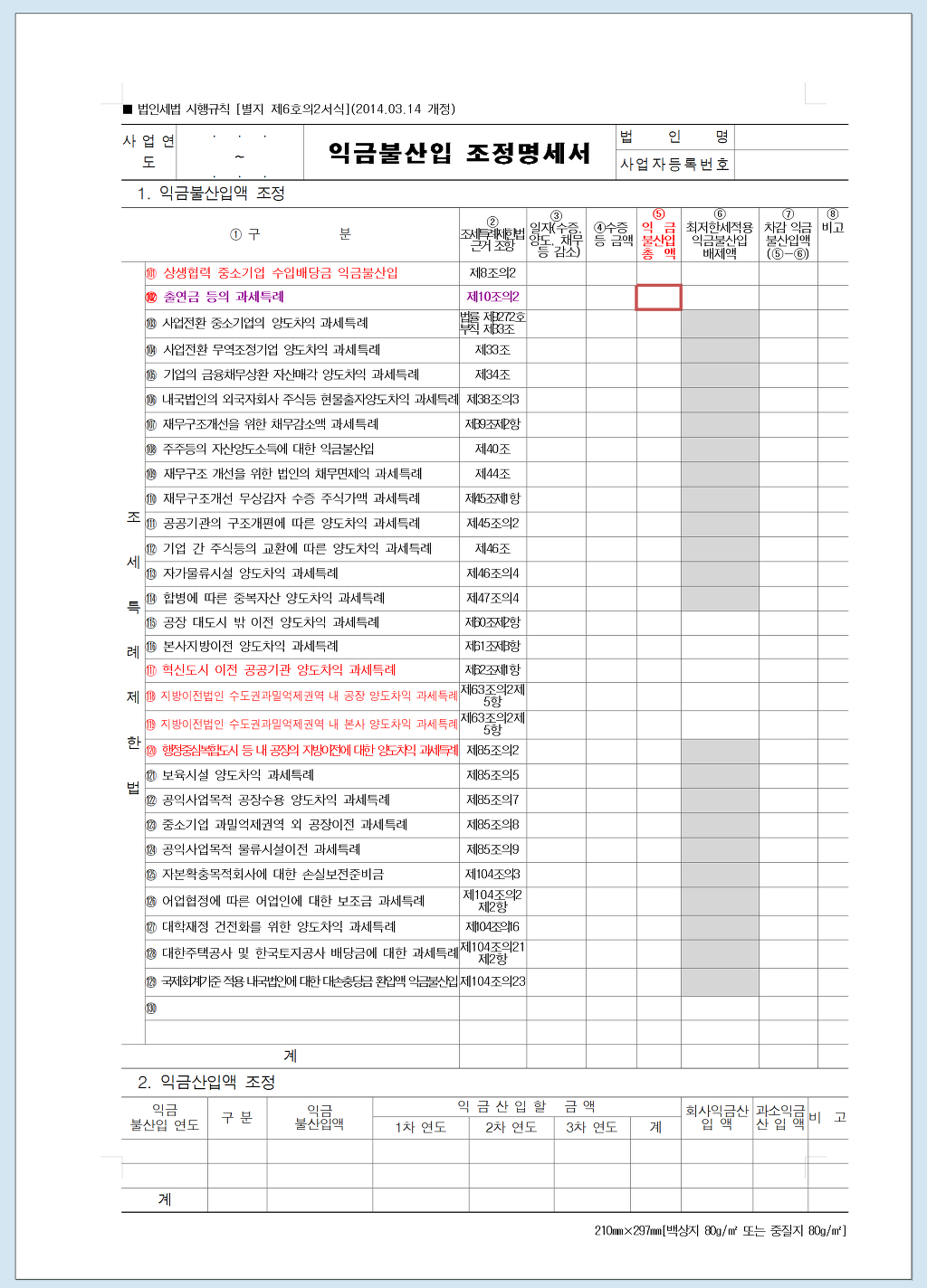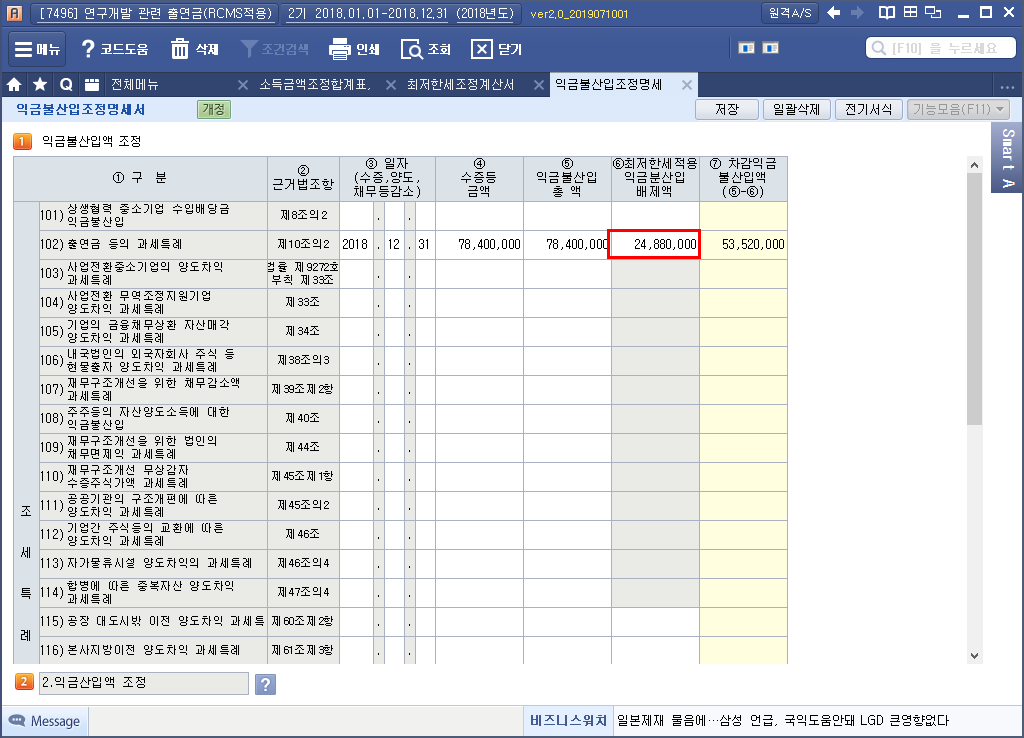 최저한세 (조특법 제132조 제2항) - 3. 연구개발관련출연금 등의 익금불산입(租法10-2) 8. 중소기업 접대비 손금산입특례(租法136①)