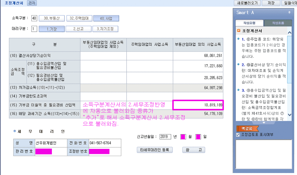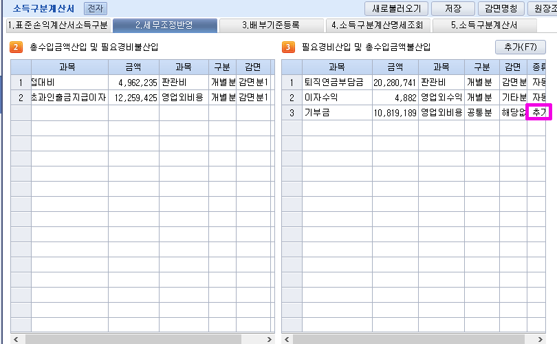 조정계산서에 (14)기부금한도초과액 / (15)기부금 이월액 중 필요경비 산입액 등 상기 F7 추가 클릭하여 직접 기재해주어야 합니다.