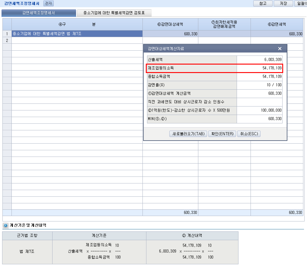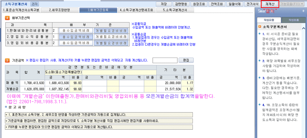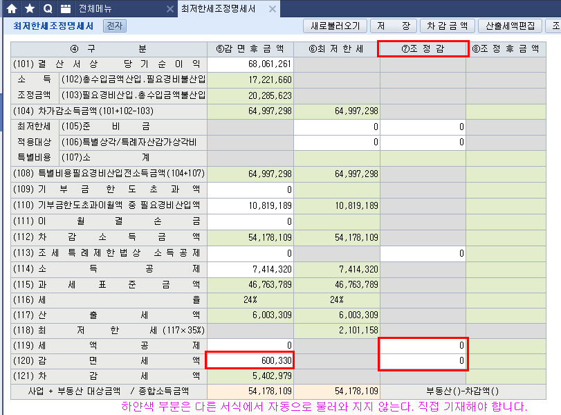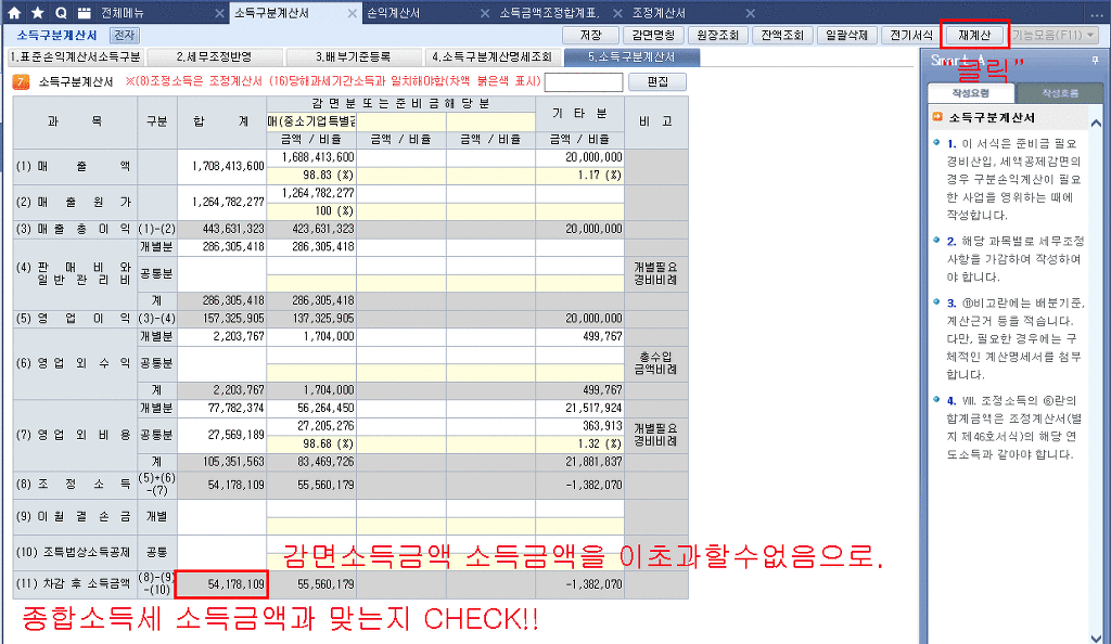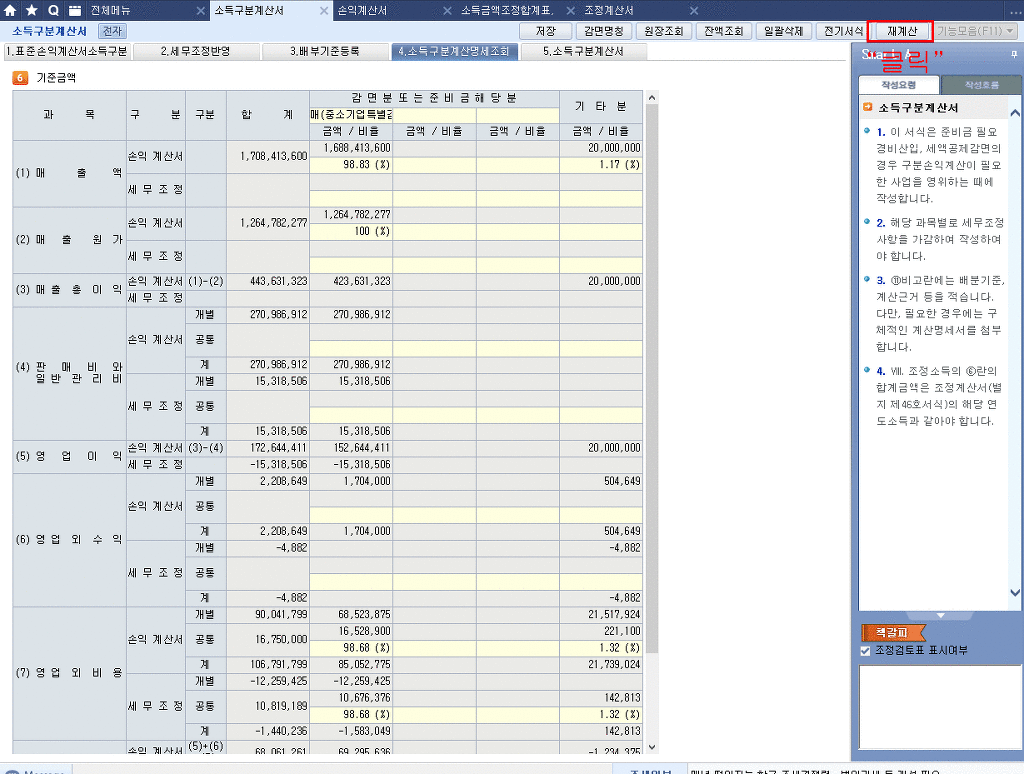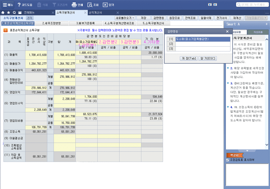 상기 "감면"의 구분은 앞 전 메뉴 1.표준손익계선서소득구분의 각 과목의 계정과목의 금액이
