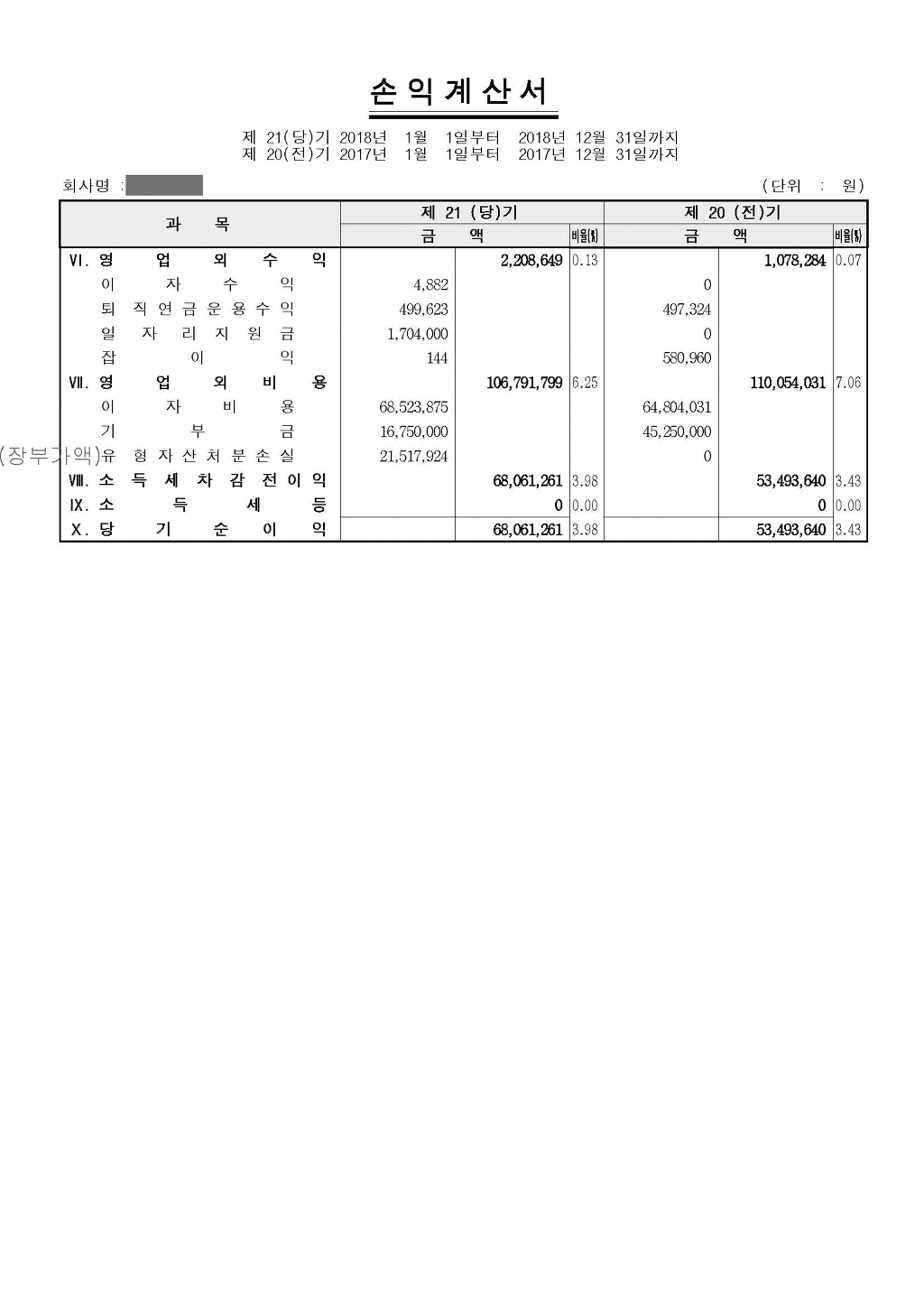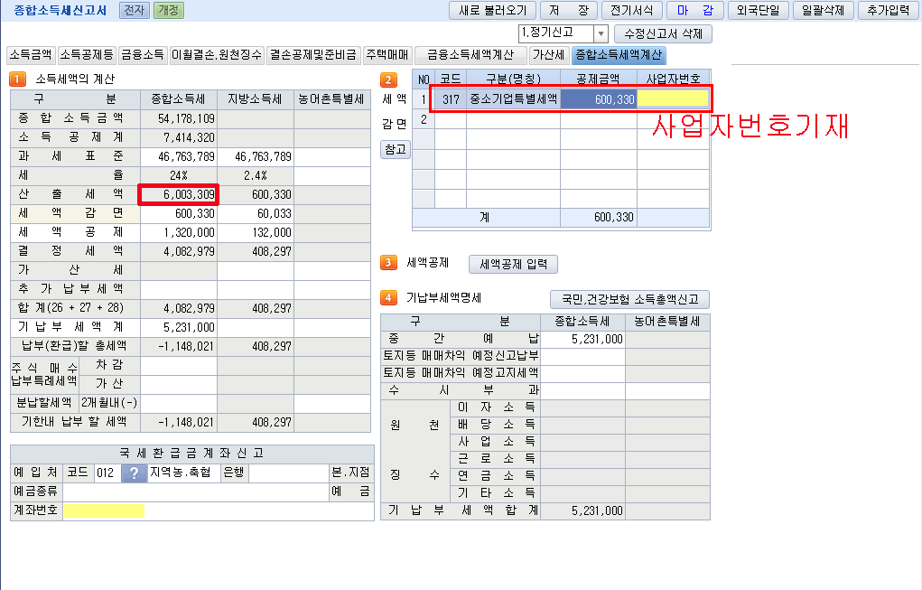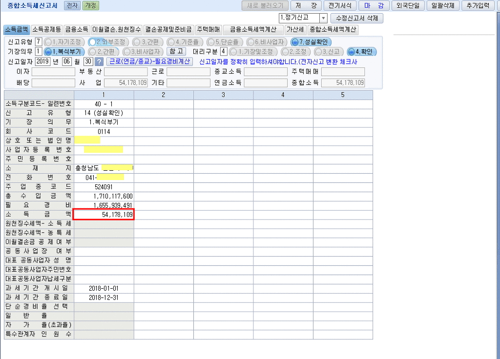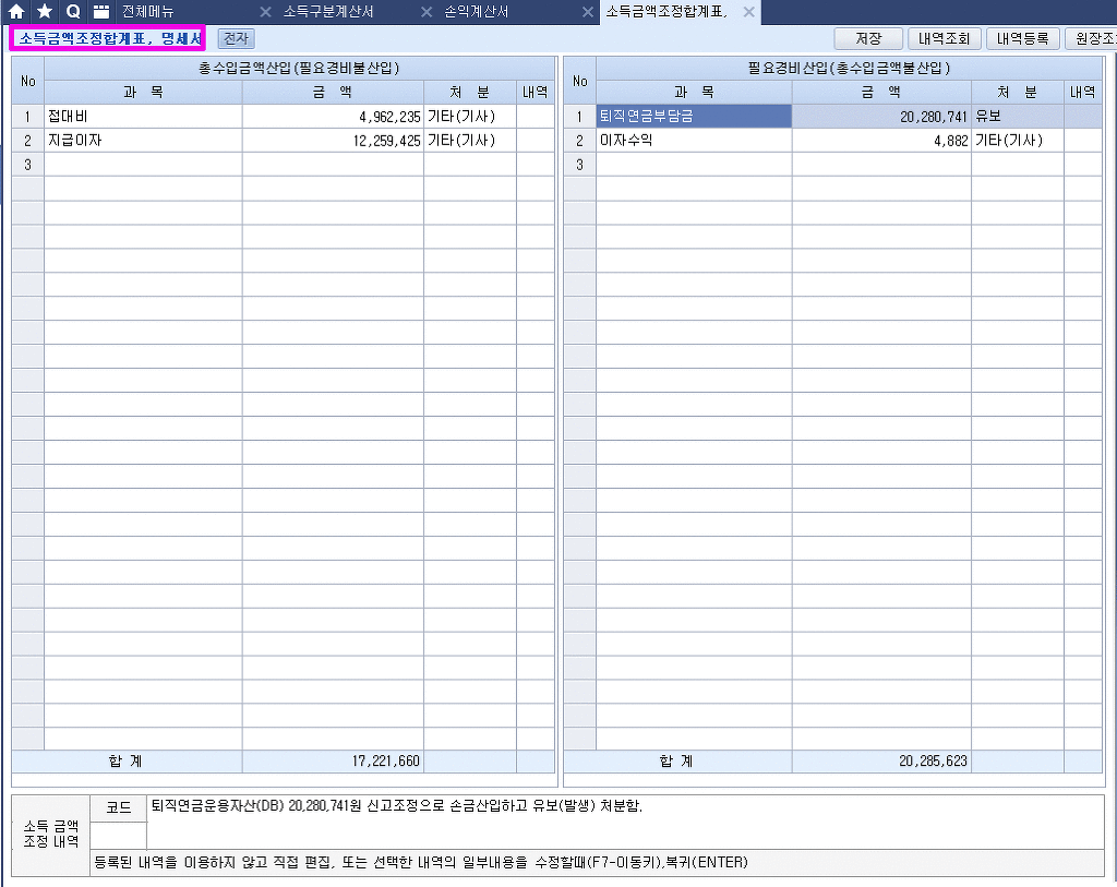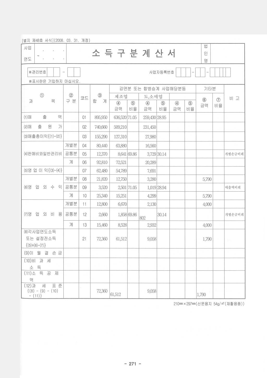 상기 "감면"의 구분은 앞 전 메뉴 1.표준손익계선서소득구분의 각 과목의 계정과목의 금액이