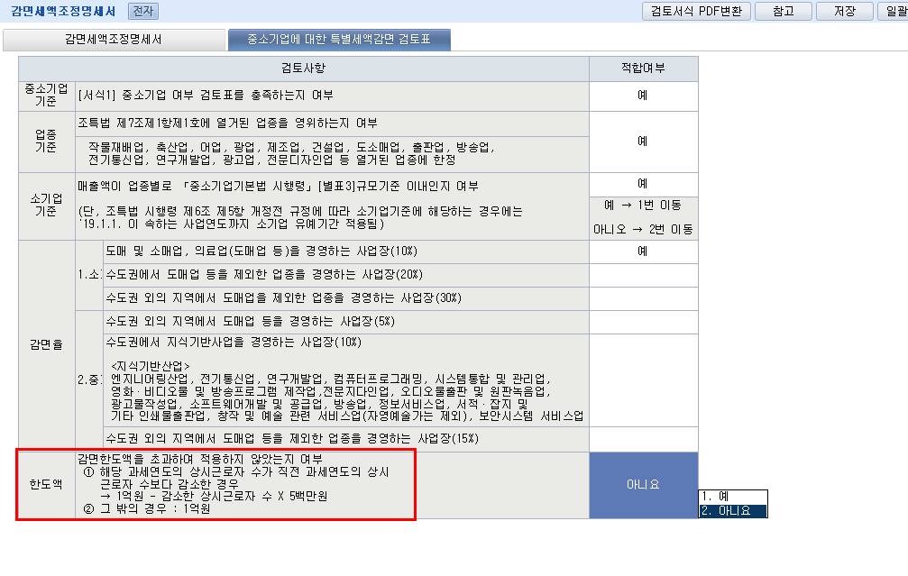 첫번째 열부터 1.감면분1 , 2.감면분2 3.감면분3 4.기타분. 5.해당없음 과 짝을 맞춰야 한다. 공통분은 구분을 "공통분" 으로 선택하면 선택할수 없고 자동으로 "해당없음"으로 바뀐다.