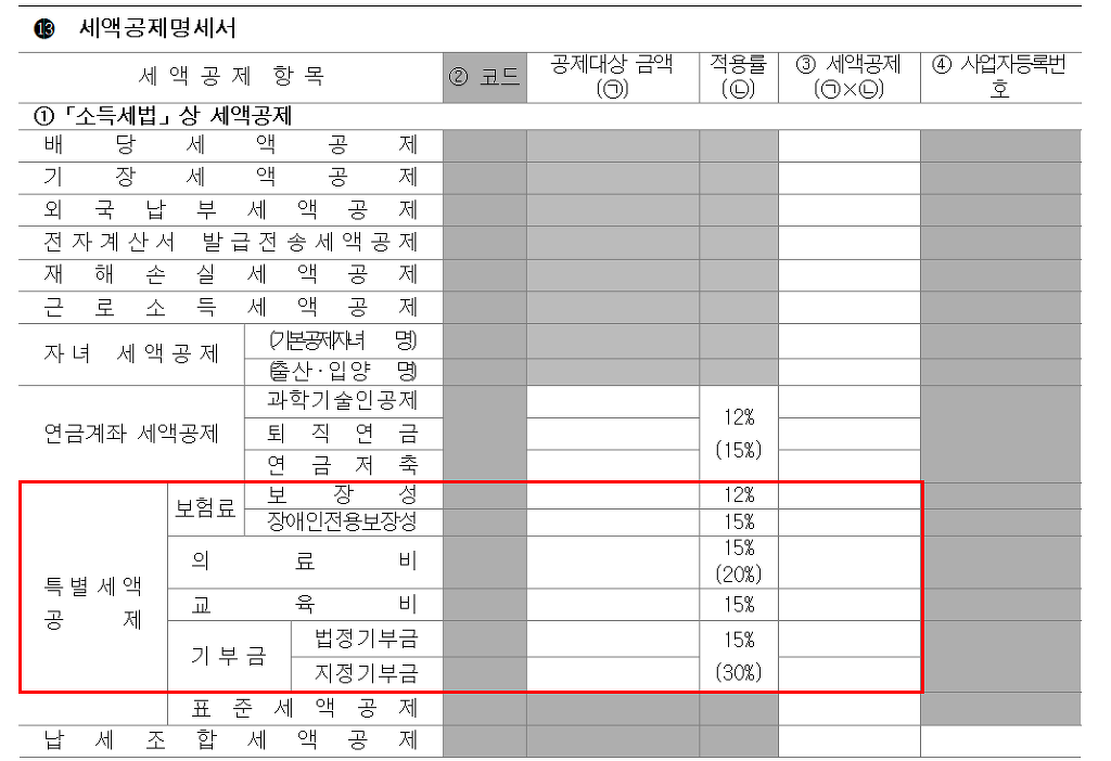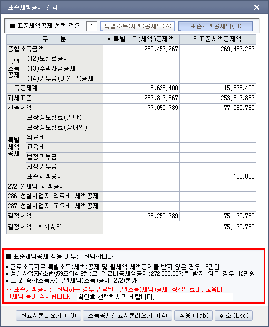 ※ 표준세액공제를 선택하는 경우 입력된 특별소득(세액)공제, 성실의료비, 교육비, 월세액 등이 삭제됩니다.