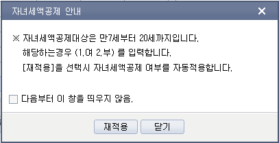 [재적용]을 선택시 자녀세액공제 여부를 자동적용합니다.