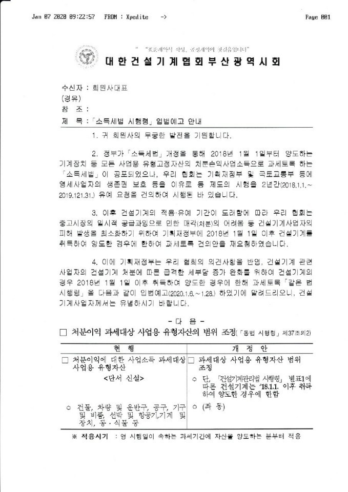 소득세법시행령부칙 [ 대통령령 제28637호 ] 2018.02.13. ▶ 적용시기 제3조 제37조의2의 개정규정은 「건설기계관리법 시행령」 별표 1에 따른 건설기계에 해당하는 경우에는 2020년 1월 1일이 속하는 과세기간에 발생하는 소득분부터 적용함 [2018.02.13 대통령령 제28637호 부칙 제3조] |