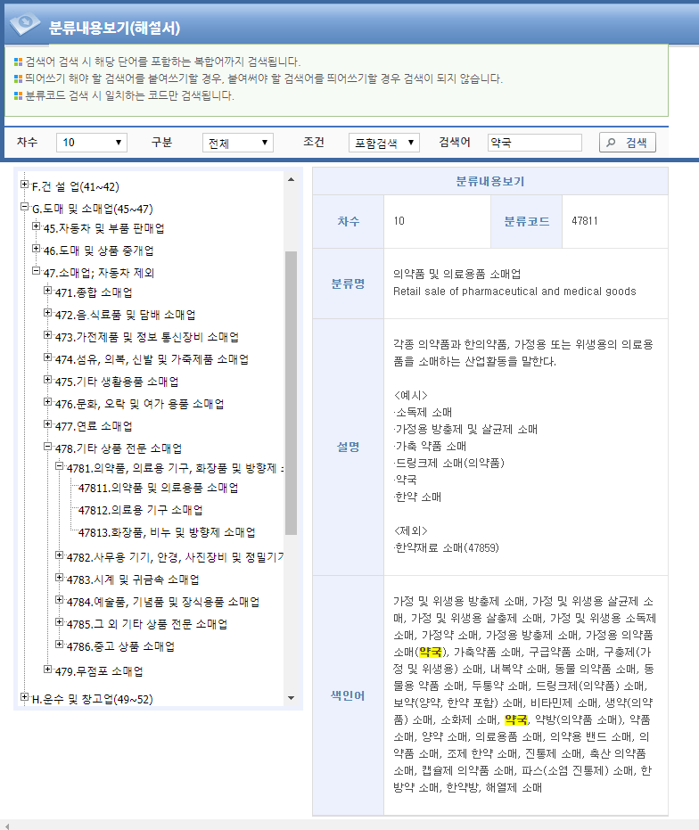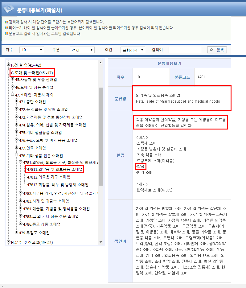 약국은 표준산업분류표상 도소매업 중 의약품 및 의료용품소매업에 해당하므로