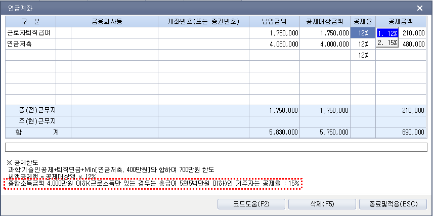 연금계좌 - 종합소득금액 4,000만원 이하 : 15% 소득금액 4천만원 초과 : 12% 작성자주RoK|작성시간20.05.29|조회수328 목록 댓글 0 글자크기 작게가 글자크기 크게가 다음검색 현재 게시글 추가 기능 열기 북마크 공유하기 신고 센터로 신고 댓글 댓글 0 댓글쓰기 답글쓰기 댓글 리스트