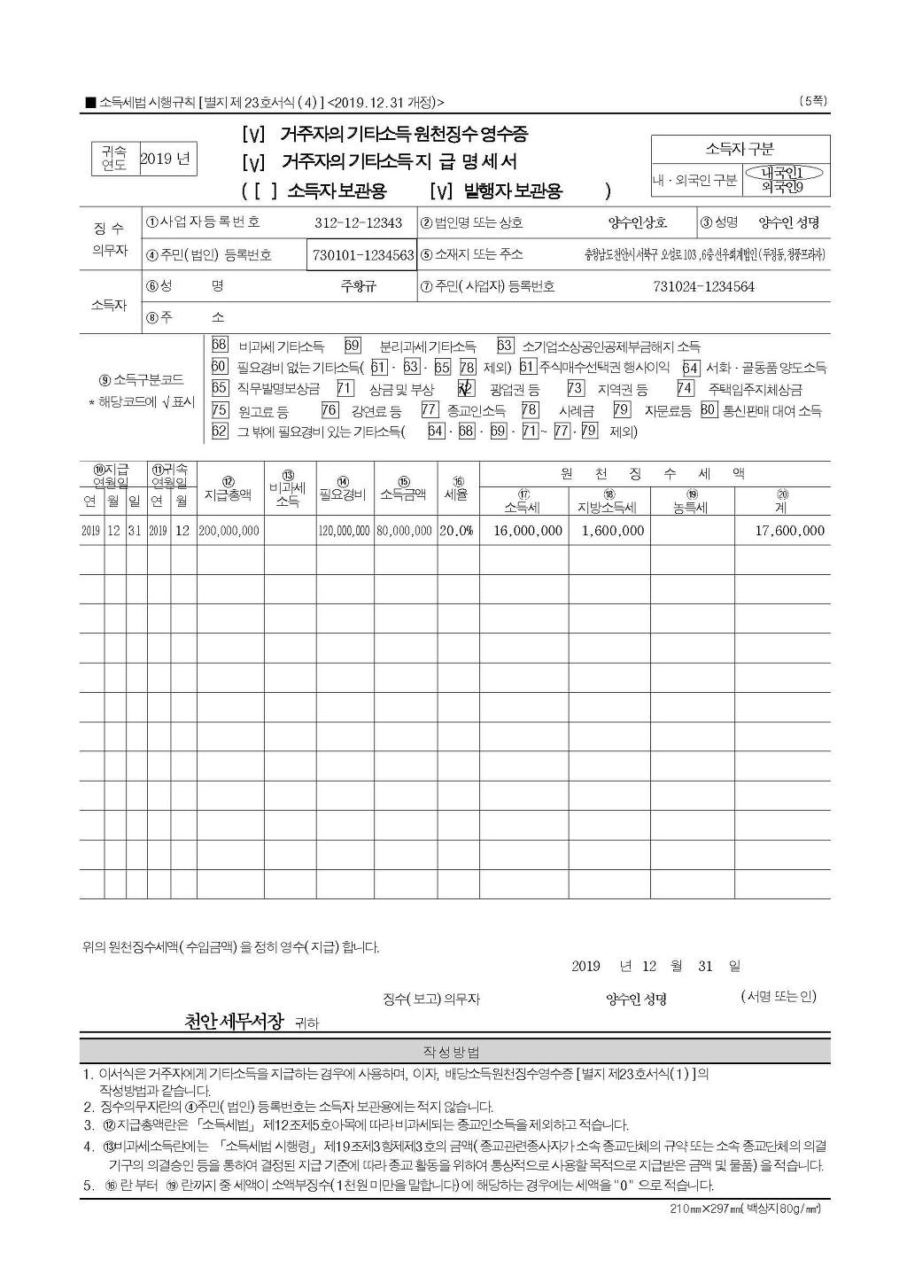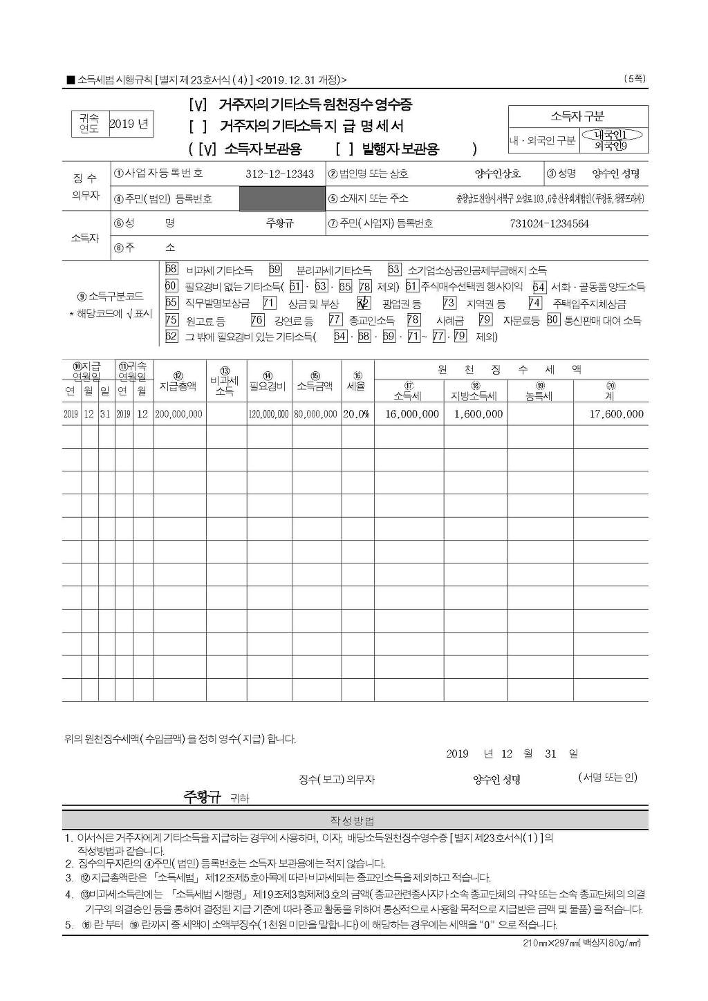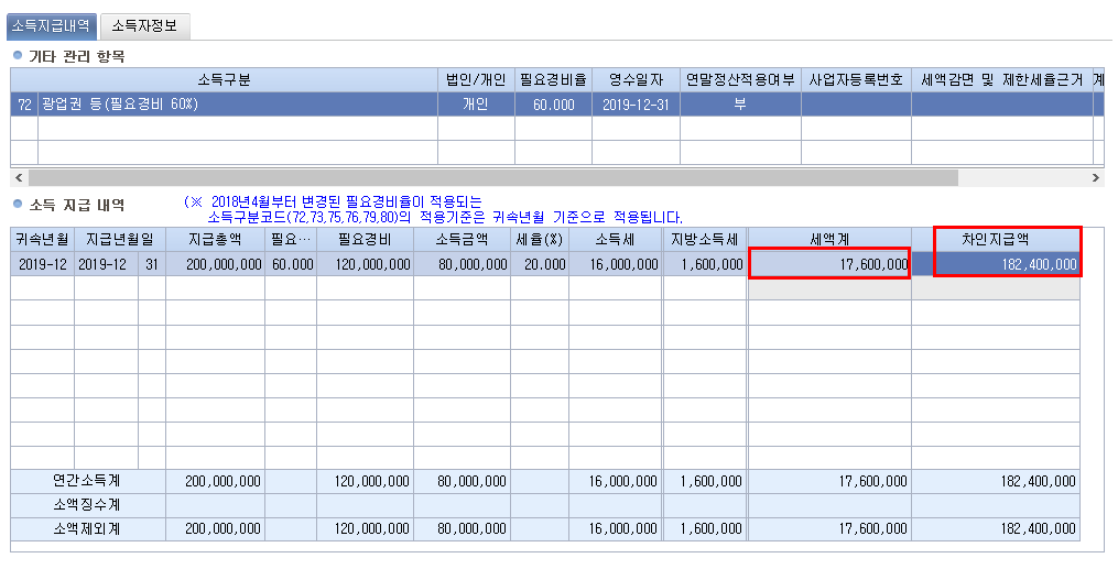 2. 아울러, 영업권 양도에 대하여는 원천징수대상 소득에 해당되는 것이므로, 영업권 양도분에 대하여는 기타소득으로 원천징수의무를 이행하여야 하는 것입니다.