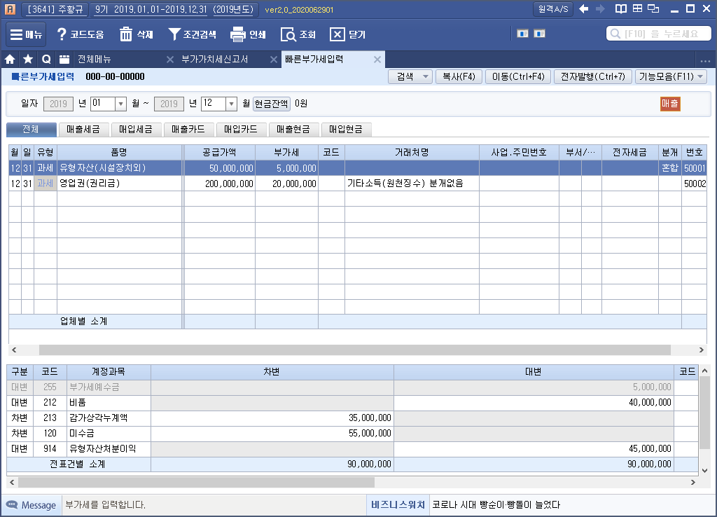 상기 세금계산서 (유형자산과 영업권(권리금) 구분 2장 발행)