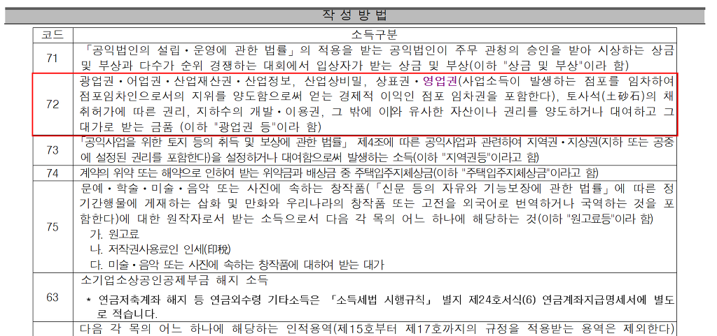그리고, 권리금을 준 사업의 ‘양수자’는 권리금에 대해 ‘기타소득’으로 원천징수신고를 해야 한다. 권리금을 받은 사업의 ‘양도자’는 ‘기타소득’으로 원천징수신고된 권리금에 대해종합소득세 신고 때 합산하여 신고하여야 한다.