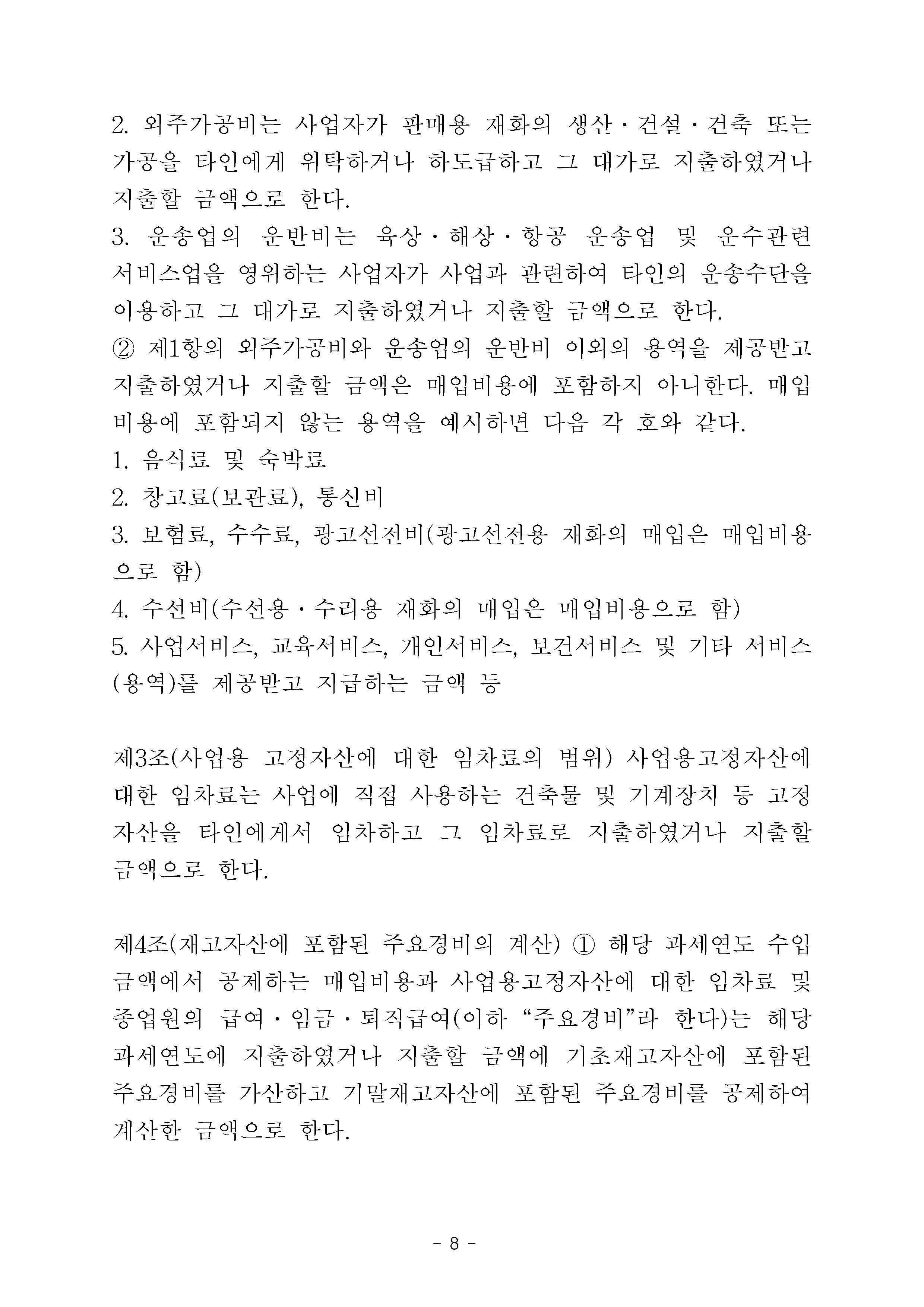 ○기준경비율이 실제 발생한 비용이 차지하는 비율 보다 높으면 사업자가 기장신고를 기피할 수 있고, 낮으면 추계신고자가 실소득보다 많은 소득세를 부담할 우려가 있으므로기준경비율은 해당 업종의 실제 비용구조에 근접하도록 합리적으로 결정되어야 합니다.