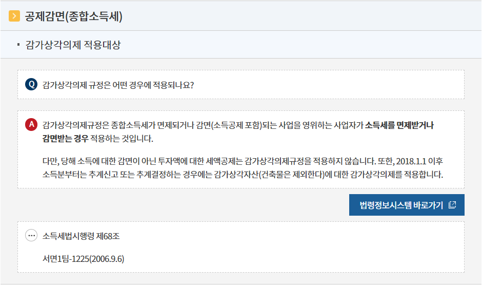 법인세를 면제,감면받는 내국법인이 2011.1.1.이후 개시하는 사업연도 분부터 각 사업연도의 소득금액을 계산할 때에는「법인세법」제23조 제1항 단서 및 같은 법 시행령 제30조 제1항에 따라 개별자산에 대한 감가상각비를 상각범위액만큼 손금에 산입하여야 하는 것이며,