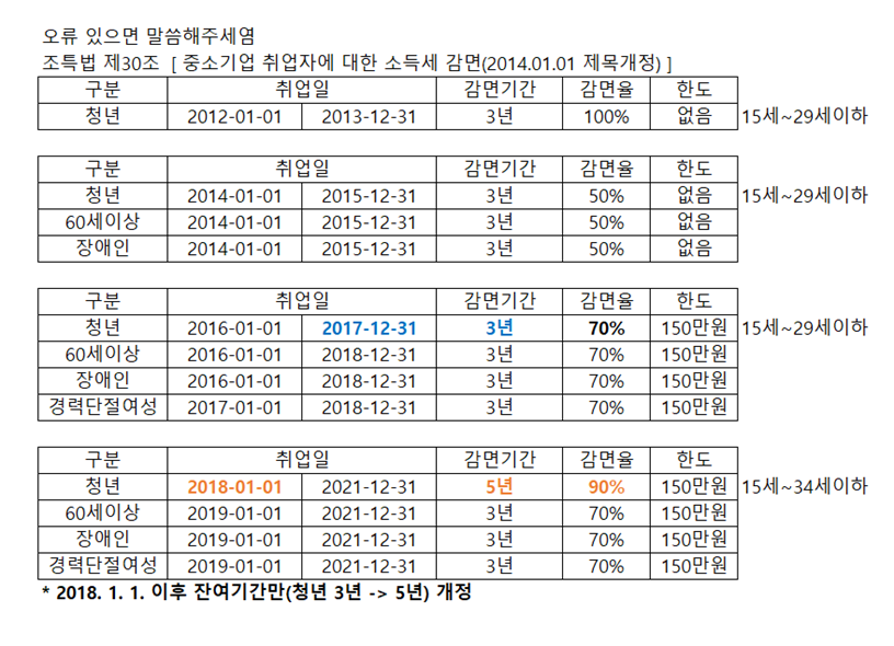 ① 대통령령으로 정하는 청년(이하 이 항에서 “청년”이라 한다), 60세 이상인 사람, 장애인 및 경력단절 여성이 「중소기업기본법」 제2조에 따른 중소기업(비영리기업을 포함한다)으로서 대통령령으로 정하는 기업(이하 이 조에서 “중소기업체”라 한다)에 2012년 1월 1일(60세 이상인 사람 또는 장애인의 경우 2014년 1월 1일)부터 2021년 12월 31일까지 취업하는 경우 그 중소기업체로부터 받는 근로소득으로서 그 취업일부터 3년(청년의 경우에는 5년)이 되는 날(청년으로서 대통령령으로 정하는 병역을 이행한 후 1년 이내에 병역 이행 전에 근로를 제공한 중소기업체에 복직하는 경우에는 복직한 날부터 2년이 되는 날을 말하며, 그 복직한 날이 최초 취업일부터 5년이 지나지 아니한 경우에는 최초 취업일부터 7년이 되는 날을 말한다)이 속하는 달까지 발생한 소득에 대해서는 소득세의 100분의 70(청년의 경우에는 100분의 90)에 상당하는 세액을 감면(과세기간별로 150만원을 한도로 한다)한다.