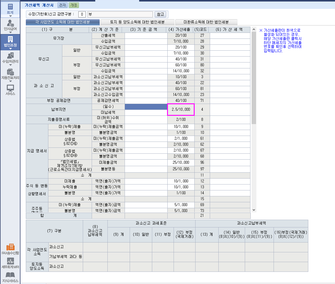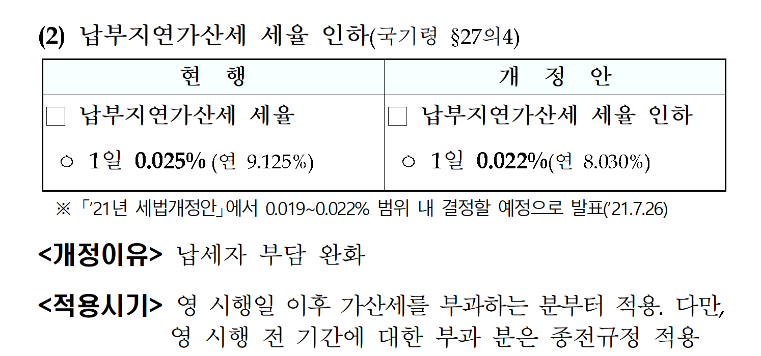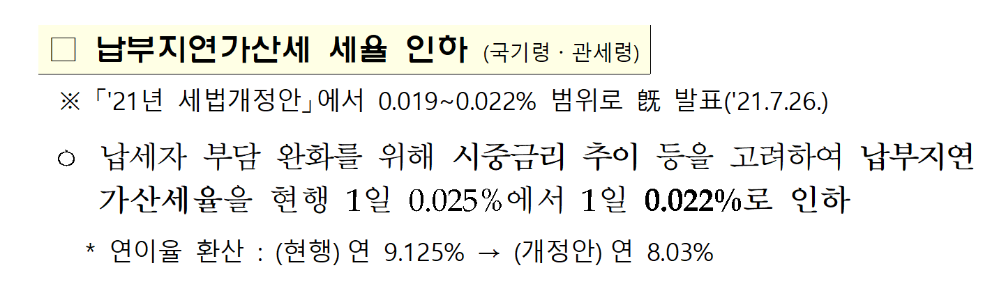 납부불성실 가산세 납부지연가산세 국세등 2022.2.15.이후 1日 0.022% (이전 0.025%) 작성자주황규|작성시간21.11.11|조회수1,585 목록 댓글 0 글자크기 작게가 글자크기 크게가 납부불성실 가산세 납부지연가산세 국세등 2019.2.12.이후 0.025% (이전 0.03%) 지방소득세 2019.1.1. 0.025% 납부지연가산세 가산금.xlsx61.06KB가산금.xlsx9.71KB 2018년도 세법 후속 시행령 개정안 마련 2019.01.07. 납부불성실가산세 2019.2.12.이후.pdf723.46KB 첨부파일첨부된 파일이 20개 있습니다. png 파일 가산세 면제.png 다운로드 png 파일 납부불성실 가산세 관세.png 다운로드 png 파일 부가가치세 가산세율.png 다운로드 png 파일 부정행위.png 다운로드 png 파일 원천징수 가산세.png 다운로드 png 파일 조특령 납부불성실가산세.png 다운로드 png 파일 납부지연가산세.png 다운로드 png 파일 납부지연 가산세 종합소득세.png 다운로드 jpg 파일 납부지연가산세.jpg 다운로드 png 파일 납부불성실가산세.png 다운로드 png 파일 납부지연가산세.png 다운로드 png 파일 지방세 납부불성실 가산세.png 다운로드 pdf 파일 납부불성실가산세 2019.2.12.이후.pdf 다운로드 png 파일 납부지연가산세.png 다운로드 png 파일 납부지연가산세.png 다운로드 png 파일 추진일정.png 다운로드 png 파일 납부지연가산세.png 다운로드 png 파일 가산금.png 다운로드 xlsx 파일 가산금.xlsx 다운로드 xlsx 파일 납부지연가산세 가산금.xlsx 다운로드 다음검색 현재 게시글 추가 기능 열기 북마크 공유하기 신고 센터로 신고 댓글 댓글 0 댓글쓰기 답글쓰기 댓글 리스트