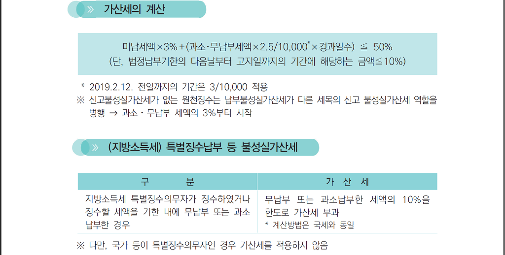 특별징수의무자가 징수하여야 할 세액을 지방세관계법에 따른 납부기한까지 납부하지 아니하거나 과소납부한 경우에는 납부하지 아니한 세액 또는 과소납부분 세액의 100분의 10에 상당하는 금액을 한도로 하여 다음 각 호의 금액을 합한 금액을 가산세로 부과한다.(2013.01.01 신설)
