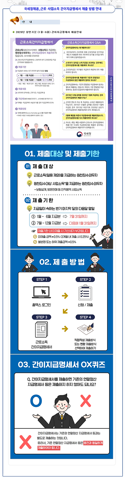 2020년 7월은 2020년 상반기(1월~6월)에 근로소득 또는 사업소득을 지급한 경우 「근로소득간이지급명세서」를 제출하는 달입니다.